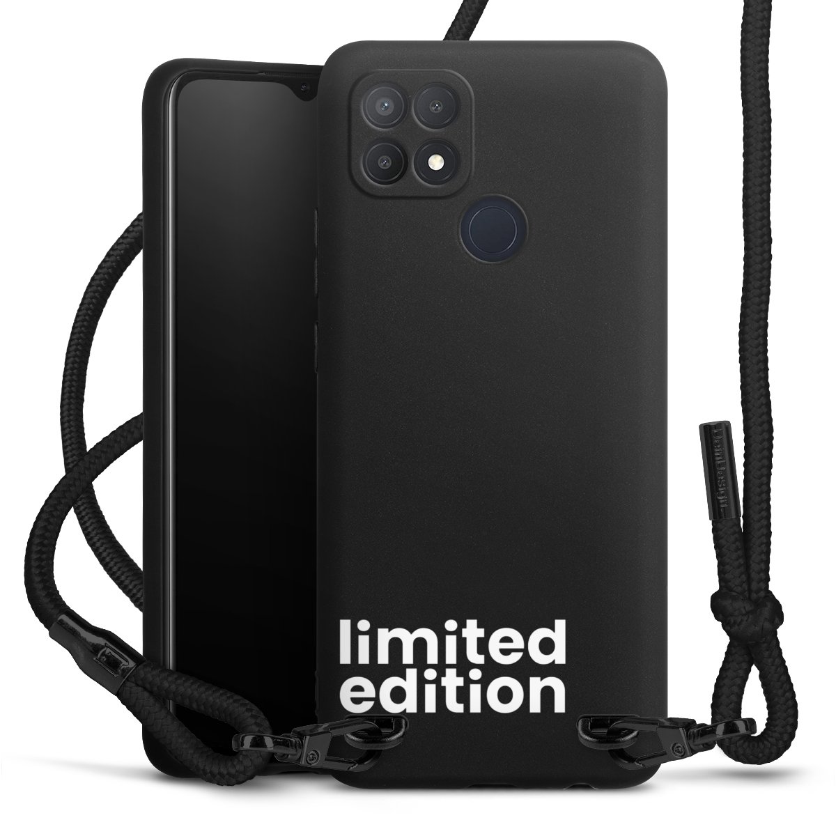 The matt black silicone case is made of flexible TPU (thermoplastic polyurethane) and offers robust protection. The durable, unbreakable material makes the cover flexible and dimensionally stable at the same time. The matte surface makes your design stand out more and is less susceptible to fingerprints and dirt. The stylish trend accessory fits comfortably in the hand and is perfectly complemented by the fabric (polyester) mobile phone strap. The braided fabric strap is approx. 1.70 metres long with a diameter of approx. 0.5 cm. Due to the special knotting technique, the length of the strap can be adjusted by simply pulling it, so that you can adapt it individually to your wishes. The practical case to wear around your neck is available with the fabric strap in black. As a little icing on the cake, we have provided the strap with a chic metal fastener in matt black. The strap is securely fastened to the case with loops made of high-quality genuine leather and press studs. The ends of the fabric strap are covered with metallic end caps and thus protected from fraying.