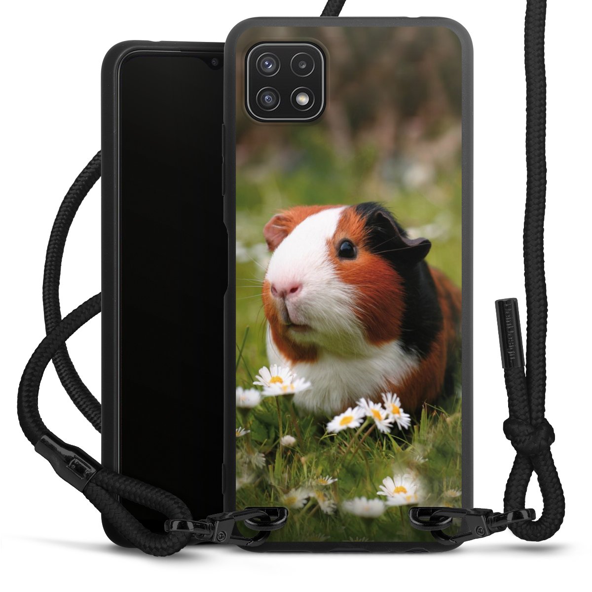 The matt black silicone case is made of flexible TPU (thermoplastic polyurethane) and offers robust protection. The durable, unbreakable material makes the cover flexible and dimensionally stable at the same time. The matte surface makes your design stand out more and is less susceptible to fingerprints and dirt. The stylish trend accessory fits comfortably in the hand and is perfectly complemented by the fabric (polyester) mobile phone strap. The braided fabric strap is approx. 1.70 metres long with a diameter of approx. 0.5 cm. Due to the special knotting technique, the length of the strap can be adjusted by simply pulling it, so that you can adapt it individually to your wishes. The practical case to wear around your neck is available with the fabric strap in black. As a little icing on the cake, we have provided the strap with a chic metal fastener in matt black. The strap is securely fastened to the case with loops made of high-quality genuine leather and press studs. The ends of the fabric strap are covered with metallic end caps and thus protected from fraying.