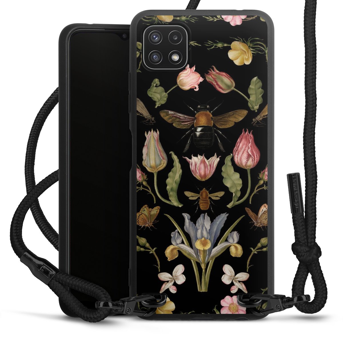 The matt black silicone case is made of flexible TPU (thermoplastic polyurethane) and offers robust protection. The durable, unbreakable material makes the cover flexible and dimensionally stable at the same time. The matte surface makes your design stand out more and is less susceptible to fingerprints and dirt. The stylish trend accessory fits comfortably in the hand and is perfectly complemented by the fabric (polyester) mobile phone strap. The braided fabric strap is approx. 1.70 metres long with a diameter of approx. 0.5 cm. Due to the special knotting technique, the length of the strap can be adjusted by simply pulling it, so that you can adapt it individually to your wishes. The practical case to wear around your neck is available with the fabric strap in black. As a little icing on the cake, we have provided the strap with a chic metal fastener in matt black. The strap is securely fastened to the case with loops made of high-quality genuine leather and press studs. The ends of the fabric strap are covered with metallic end caps and thus protected from fraying.