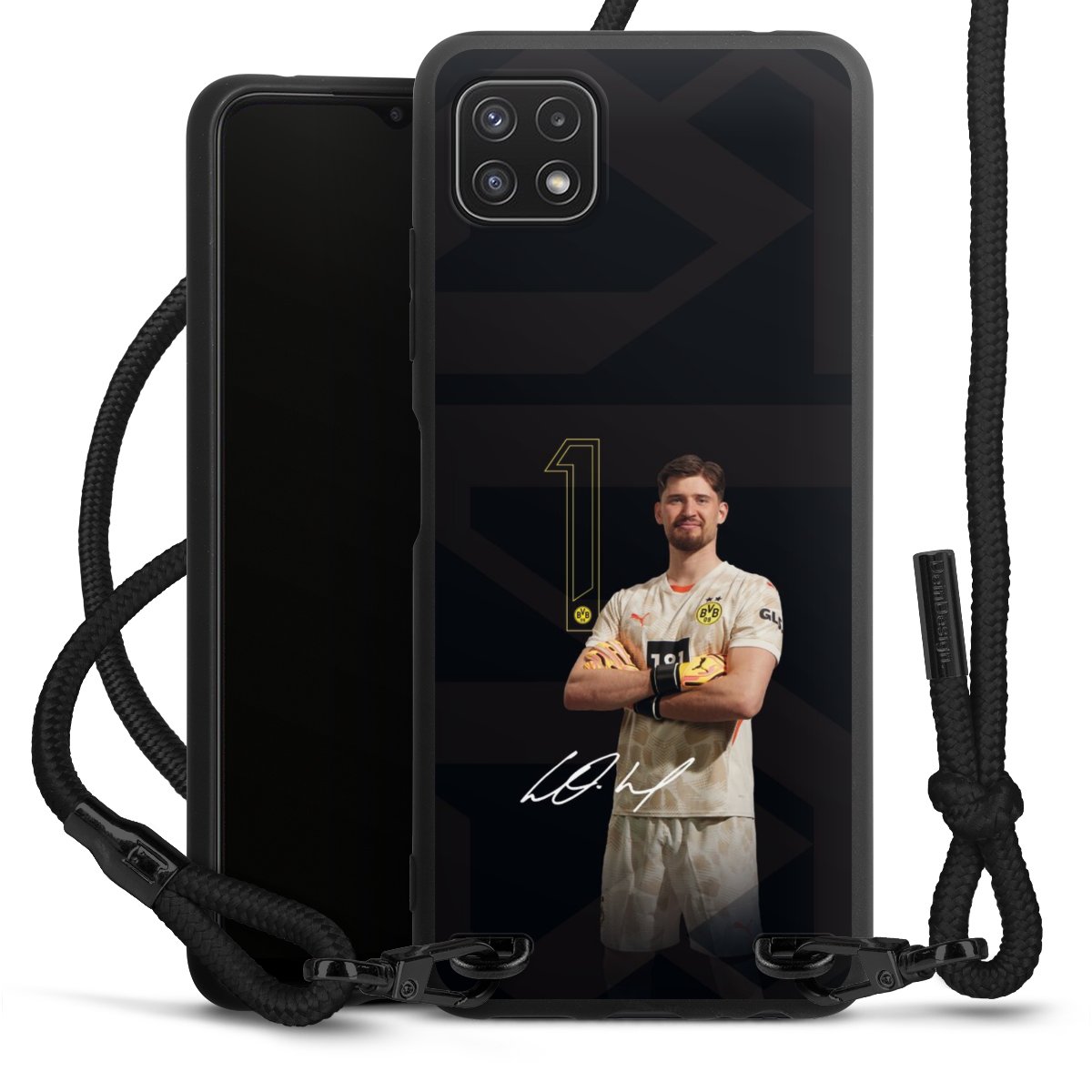 The matt black silicone case is made of flexible TPU (thermoplastic polyurethane) and offers robust protection. The durable, unbreakable material makes the cover flexible and dimensionally stable at the same time. The matte surface makes your design stand out more and is less susceptible to fingerprints and dirt. The stylish trend accessory fits comfortably in the hand and is perfectly complemented by the fabric (polyester) mobile phone strap. The braided fabric strap is approx. 1.70 metres long with a diameter of approx. 0.5 cm. Due to the special knotting technique, the length of the strap can be adjusted by simply pulling it, so that you can adapt it individually to your wishes. The practical case to wear around your neck is available with the fabric strap in black. As a little icing on the cake, we have provided the strap with a chic metal fastener in matt black. The strap is securely fastened to the case with loops made of high-quality genuine leather and press studs. The ends of the fabric strap are covered with metallic end caps and thus protected from fraying.