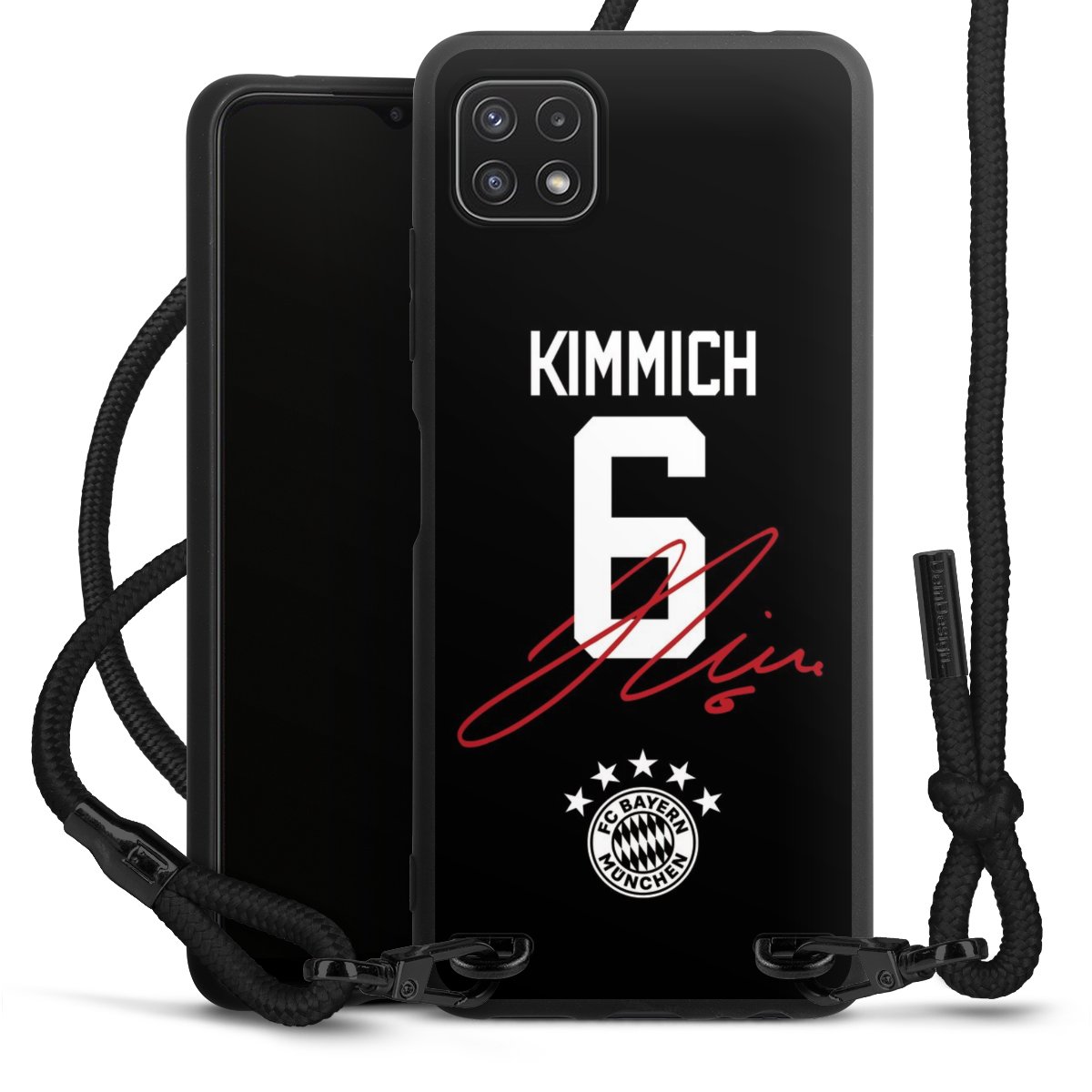 The matt black silicone case is made of flexible TPU (thermoplastic polyurethane) and offers robust protection. The durable, unbreakable material makes the cover flexible and dimensionally stable at the same time. The matte surface makes your design stand out more and is less susceptible to fingerprints and dirt. The stylish trend accessory fits comfortably in the hand and is perfectly complemented by the fabric (polyester) mobile phone strap. The braided fabric strap is approx. 1.70 metres long with a diameter of approx. 0.5 cm. Due to the special knotting technique, the length of the strap can be adjusted by simply pulling it, so that you can adapt it individually to your wishes. The practical case to wear around your neck is available with the fabric strap in black. As a little icing on the cake, we have provided the strap with a chic metal fastener in matt black. The strap is securely fastened to the case with loops made of high-quality genuine leather and press studs. The ends of the fabric strap are covered with metallic end caps and thus protected from fraying.