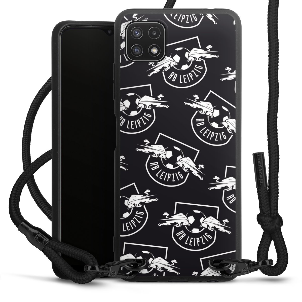 The matt black silicone case is made of flexible TPU (thermoplastic polyurethane) and offers robust protection. The durable, unbreakable material makes the cover flexible and dimensionally stable at the same time. The matte surface makes your design stand out more and is less susceptible to fingerprints and dirt. The stylish trend accessory fits comfortably in the hand and is perfectly complemented by the fabric (polyester) mobile phone strap. The braided fabric strap is approx. 1.70 metres long with a diameter of approx. 0.5 cm. Due to the special knotting technique, the length of the strap can be adjusted by simply pulling it, so that you can adapt it individually to your wishes. The practical case to wear around your neck is available with the fabric strap in black. As a little icing on the cake, we have provided the strap with a chic metal fastener in matt black. The strap is securely fastened to the case with loops made of high-quality genuine leather and press studs. The ends of the fabric strap are covered with metallic end caps and thus protected from fraying.