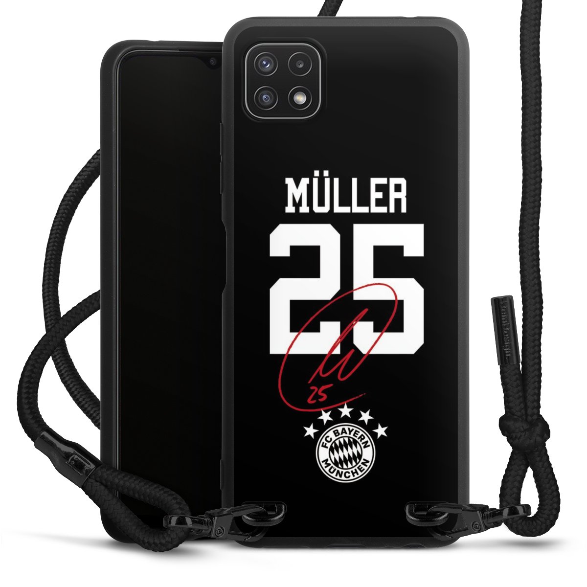 The matt black silicone case is made of flexible TPU (thermoplastic polyurethane) and offers robust protection. The durable, unbreakable material makes the cover flexible and dimensionally stable at the same time. The matte surface makes your design stand out more and is less susceptible to fingerprints and dirt. The stylish trend accessory fits comfortably in the hand and is perfectly complemented by the fabric (polyester) mobile phone strap. The braided fabric strap is approx. 1.70 metres long with a diameter of approx. 0.5 cm. Due to the special knotting technique, the length of the strap can be adjusted by simply pulling it, so that you can adapt it individually to your wishes. The practical case to wear around your neck is available with the fabric strap in black. As a little icing on the cake, we have provided the strap with a chic metal fastener in matt black. The strap is securely fastened to the case with loops made of high-quality genuine leather and press studs. The ends of the fabric strap are covered with metallic end caps and thus protected from fraying.