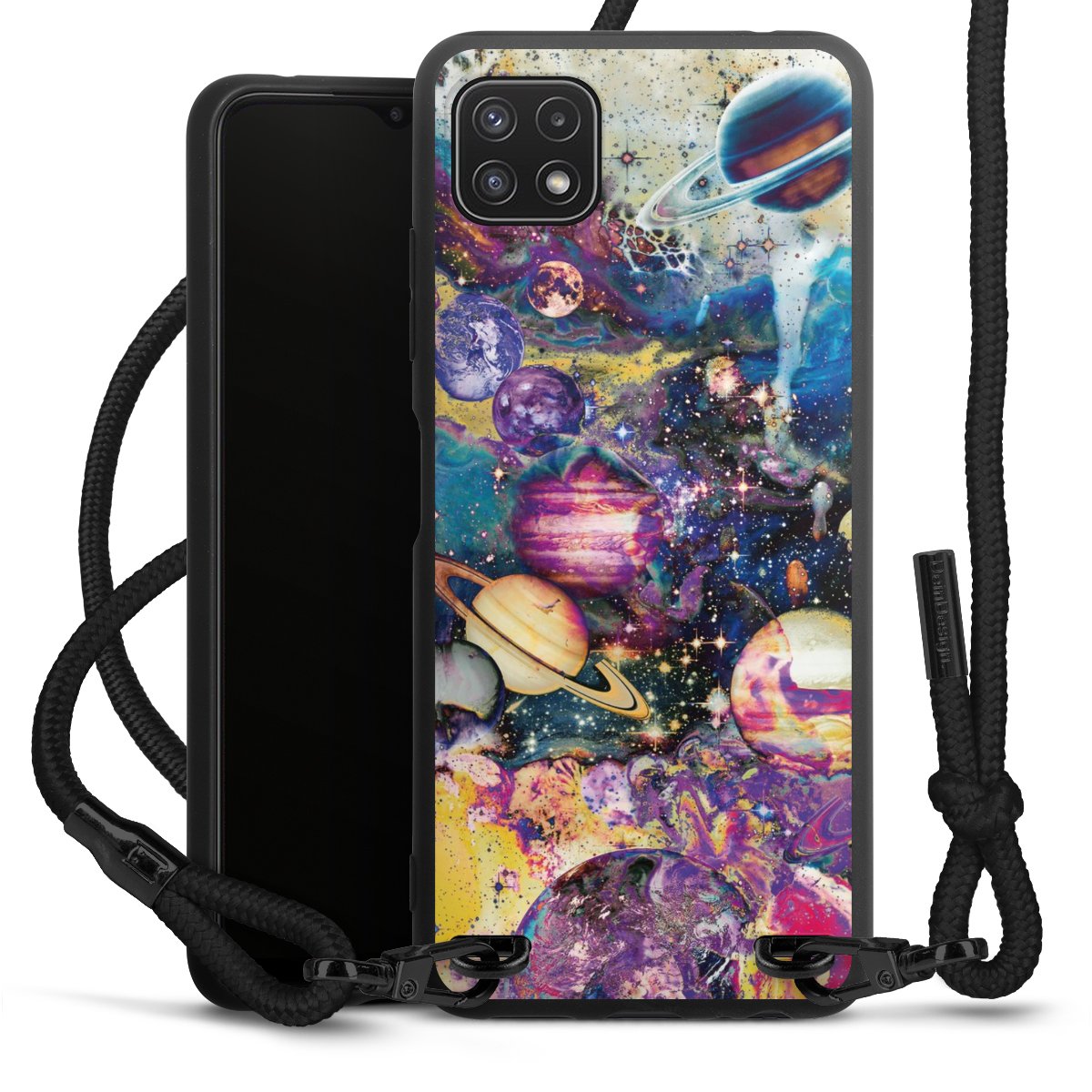 We use the solid direct print process for this phone case, which is why the print area only covers the back and the edge remains unprinted. The case to wear around your neck can be ordered unprinted, fully printed, or partially printed. For your design, either choose one of our exclusive shop motifs or get creative and create your own design, for example with photos and overlays. Design your own personal trend accessory and make an individual statement on the streets!
