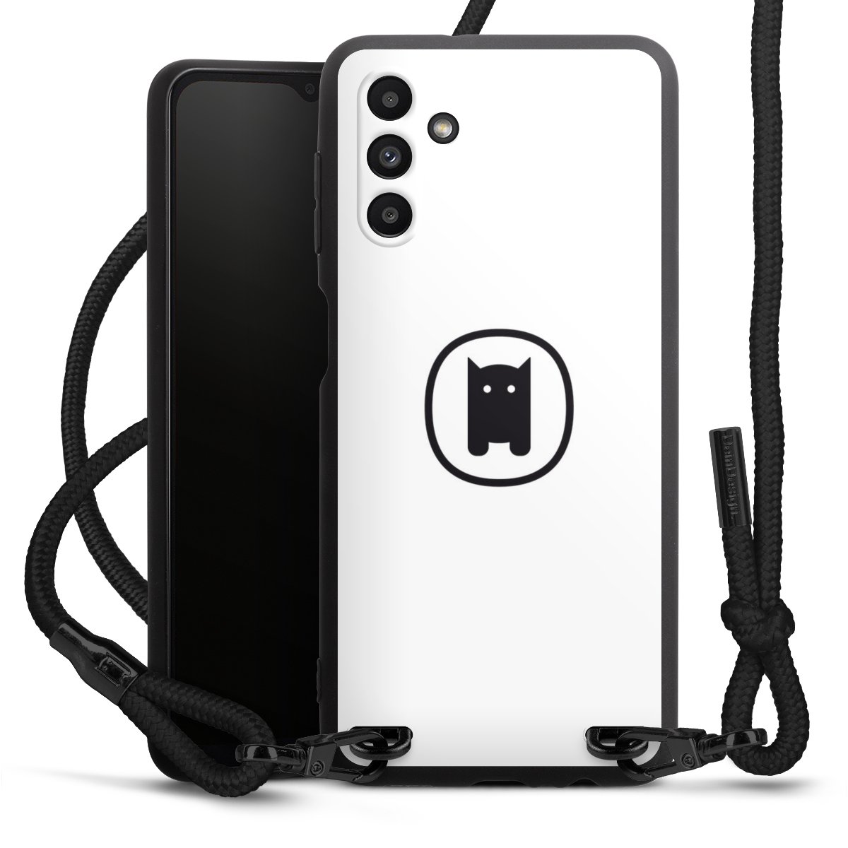 The matt black silicone case is made of flexible TPU (thermoplastic polyurethane) and offers robust protection. The durable, unbreakable material makes the cover flexible and dimensionally stable at the same time. The matte surface makes your design stand out more and is less susceptible to fingerprints and dirt. The stylish trend accessory fits comfortably in the hand and is perfectly complemented by the fabric (polyester) mobile phone strap. The braided fabric strap is approx. 1.70 metres long with a diameter of approx. 0.5 cm. Due to the special knotting technique, the length of the strap can be adjusted by simply pulling it, so that you can adapt it individually to your wishes. The practical case to wear around your neck is available with the fabric strap in black. As a little icing on the cake, we have provided the strap with a chic metal fastener in matt black. The strap is securely fastened to the case with loops made of high-quality genuine leather and press studs. The ends of the fabric strap are covered with metallic end caps and thus protected from fraying.