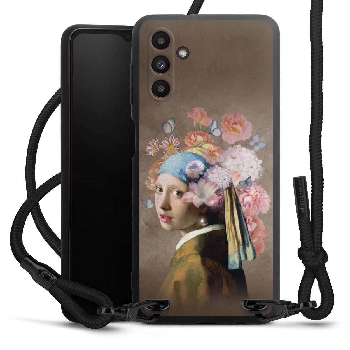 The matt black silicone case is made of flexible TPU (thermoplastic polyurethane) and offers robust protection. The durable, unbreakable material makes the cover flexible and dimensionally stable at the same time. The matte surface makes your design stand out more and is less susceptible to fingerprints and dirt. The stylish trend accessory fits comfortably in the hand and is perfectly complemented by the fabric (polyester) mobile phone strap. The braided fabric strap is approx. 1.70 metres long with a diameter of approx. 0.5 cm. Due to the special knotting technique, the length of the strap can be adjusted by simply pulling it, so that you can adapt it individually to your wishes. The practical case to wear around your neck is available with the fabric strap in black. As a little icing on the cake, we have provided the strap with a chic metal fastener in matt black. The strap is securely fastened to the case with loops made of high-quality genuine leather and press studs. The ends of the fabric strap are covered with metallic end caps and thus protected from fraying.