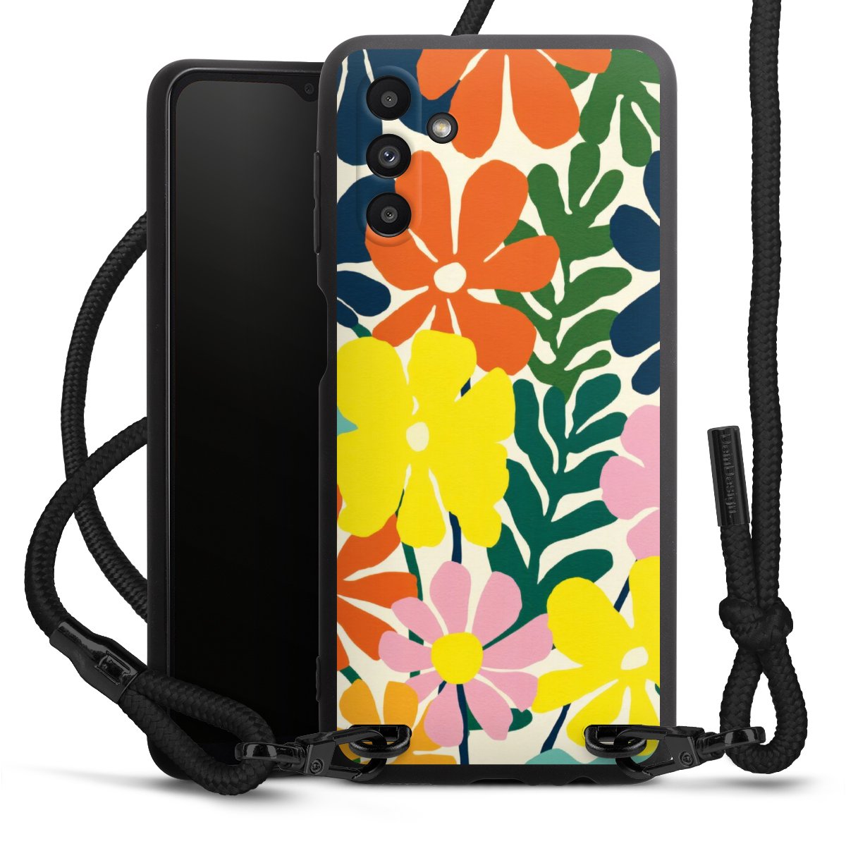 The matt black silicone case is made of flexible TPU (thermoplastic polyurethane) and offers robust protection. The durable, unbreakable material makes the cover flexible and dimensionally stable at the same time. The matte surface makes your design stand out more and is less susceptible to fingerprints and dirt. The stylish trend accessory fits comfortably in the hand and is perfectly complemented by the fabric (polyester) mobile phone strap. The braided fabric strap is approx. 1.70 metres long with a diameter of approx. 0.5 cm. Due to the special knotting technique, the length of the strap can be adjusted by simply pulling it, so that you can adapt it individually to your wishes. The practical case to wear around your neck is available with the fabric strap in black. As a little icing on the cake, we have provided the strap with a chic metal fastener in matt black. The strap is securely fastened to the case with loops made of high-quality genuine leather and press studs. The ends of the fabric strap are covered with metallic end caps and thus protected from fraying.