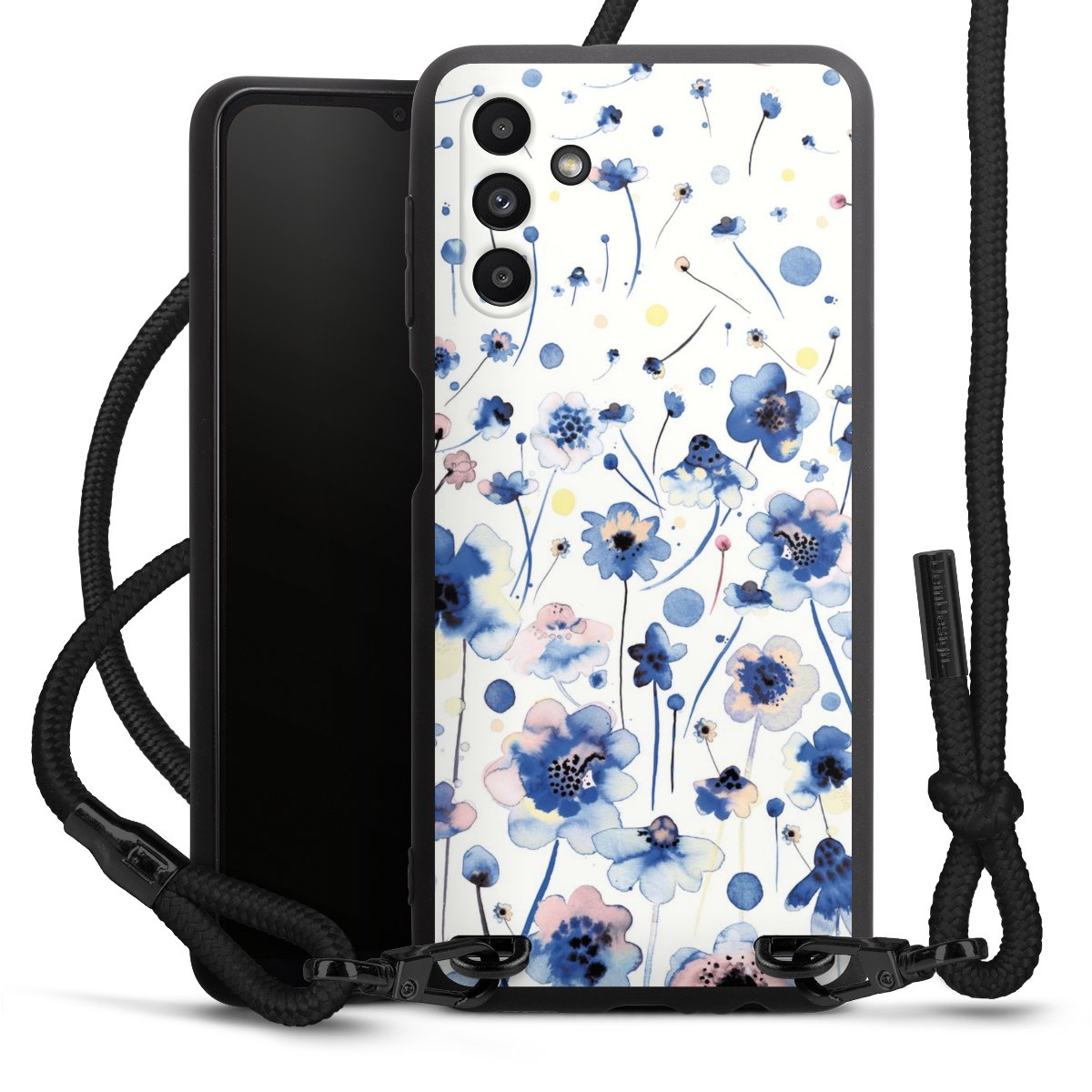 The matt black silicone case is made of flexible TPU (thermoplastic polyurethane) and offers robust protection. The durable, unbreakable material makes the cover flexible and dimensionally stable at the same time. The matte surface makes your design stand out more and is less susceptible to fingerprints and dirt. The stylish trend accessory fits comfortably in the hand and is perfectly complemented by the fabric (polyester) mobile phone strap. The braided fabric strap is approx. 1.70 metres long with a diameter of approx. 0.5 cm. Due to the special knotting technique, the length of the strap can be adjusted by simply pulling it, so that you can adapt it individually to your wishes. The practical case to wear around your neck is available with the fabric strap in black. As a little icing on the cake, we have provided the strap with a chic metal fastener in matt black. The strap is securely fastened to the case with loops made of high-quality genuine leather and press studs. The ends of the fabric strap are covered with metallic end caps and thus protected from fraying.