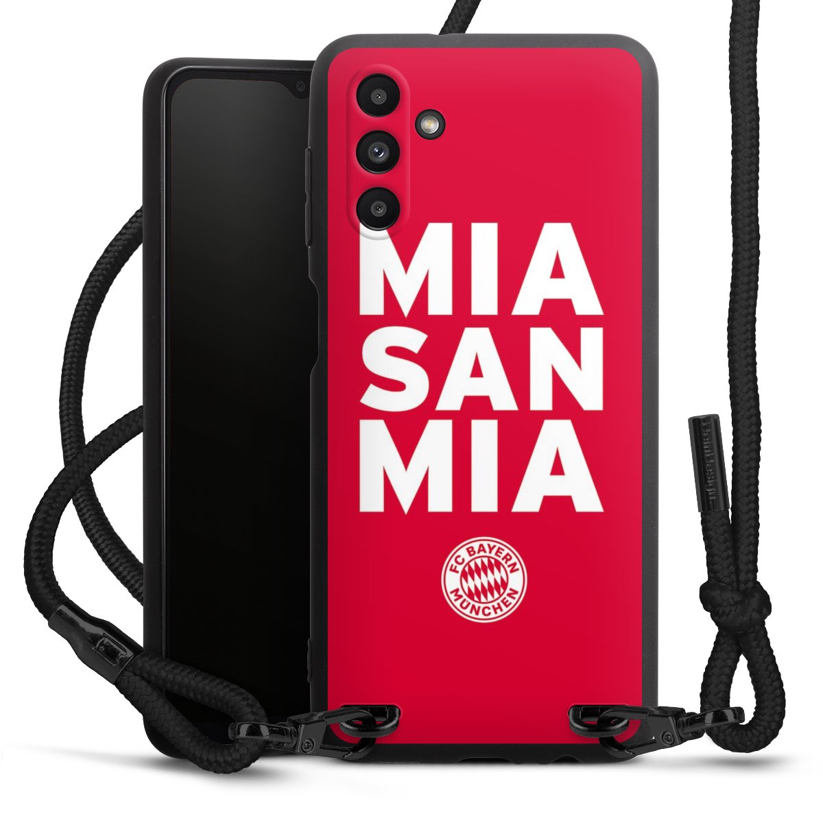 The matt black silicone case is made of flexible TPU (thermoplastic polyurethane) and offers robust protection. The durable, unbreakable material makes the cover flexible and dimensionally stable at the same time. The matte surface makes your design stand out more and is less susceptible to fingerprints and dirt. The stylish trend accessory fits comfortably in the hand and is perfectly complemented by the fabric (polyester) mobile phone strap. The braided fabric strap is approx. 1.70 metres long with a diameter of approx. 0.5 cm. Due to the special knotting technique, the length of the strap can be adjusted by simply pulling it, so that you can adapt it individually to your wishes. The practical case to wear around your neck is available with the fabric strap in black. As a little icing on the cake, we have provided the strap with a chic metal fastener in matt black. The strap is securely fastened to the case with loops made of high-quality genuine leather and press studs. The ends of the fabric strap are covered with metallic end caps and thus protected from fraying.