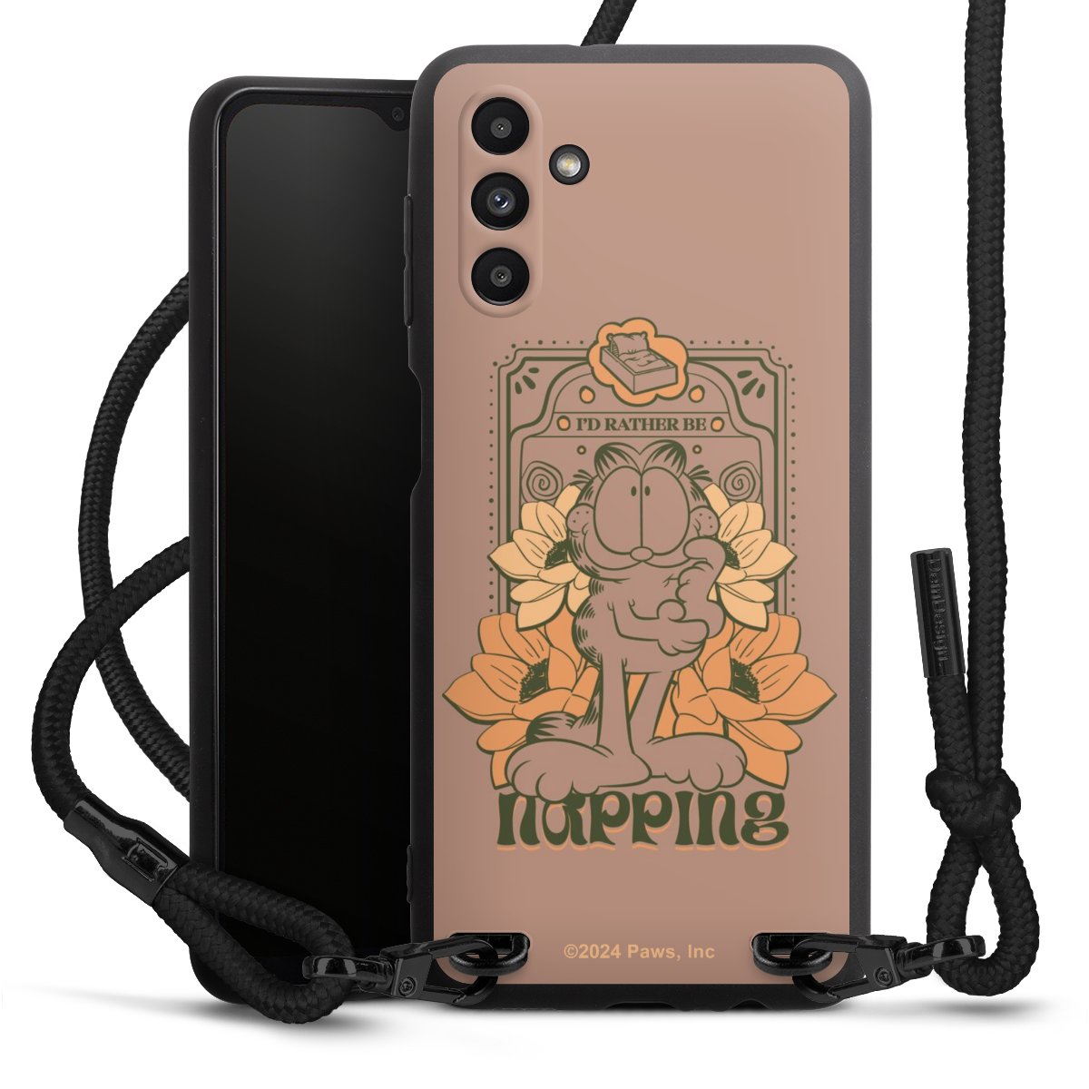 The matt black silicone case is made of flexible TPU (thermoplastic polyurethane) and offers robust protection. The durable, unbreakable material makes the cover flexible and dimensionally stable at the same time. The matte surface makes your design stand out more and is less susceptible to fingerprints and dirt. The stylish trend accessory fits comfortably in the hand and is perfectly complemented by the fabric (polyester) mobile phone strap. The braided fabric strap is approx. 1.70 metres long with a diameter of approx. 0.5 cm. Due to the special knotting technique, the length of the strap can be adjusted by simply pulling it, so that you can adapt it individually to your wishes. The practical case to wear around your neck is available with the fabric strap in black. As a little icing on the cake, we have provided the strap with a chic metal fastener in matt black. The strap is securely fastened to the case with loops made of high-quality genuine leather and press studs. The ends of the fabric strap are covered with metallic end caps and thus protected from fraying.