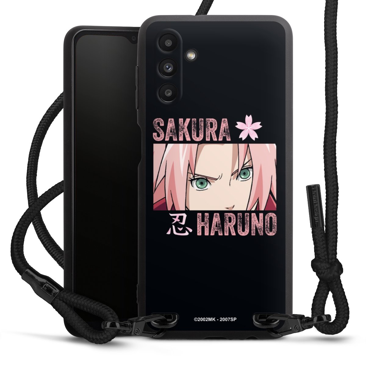 The matt black silicone case is made of flexible TPU (thermoplastic polyurethane) and offers robust protection. The durable, unbreakable material makes the cover flexible and dimensionally stable at the same time. The matte surface makes your design stand out more and is less susceptible to fingerprints and dirt. The stylish trend accessory fits comfortably in the hand and is perfectly complemented by the fabric (polyester) mobile phone strap. The braided fabric strap is approx. 1.70 metres long with a diameter of approx. 0.5 cm. Due to the special knotting technique, the length of the strap can be adjusted by simply pulling it, so that you can adapt it individually to your wishes. The practical case to wear around your neck is available with the fabric strap in black. As a little icing on the cake, we have provided the strap with a chic metal fastener in matt black. The strap is securely fastened to the case with loops made of high-quality genuine leather and press studs. The ends of the fabric strap are covered with metallic end caps and thus protected from fraying.