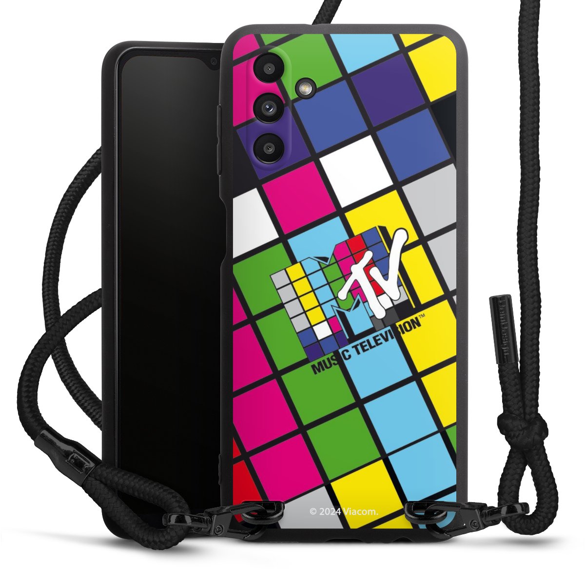 The matt black silicone case is made of flexible TPU (thermoplastic polyurethane) and offers robust protection. The durable, unbreakable material makes the cover flexible and dimensionally stable at the same time. The matte surface makes your design stand out more and is less susceptible to fingerprints and dirt. The stylish trend accessory fits comfortably in the hand and is perfectly complemented by the fabric (polyester) mobile phone strap. The braided fabric strap is approx. 1.70 metres long with a diameter of approx. 0.5 cm. Due to the special knotting technique, the length of the strap can be adjusted by simply pulling it, so that you can adapt it individually to your wishes. The practical case to wear around your neck is available with the fabric strap in black. As a little icing on the cake, we have provided the strap with a chic metal fastener in matt black. The strap is securely fastened to the case with loops made of high-quality genuine leather and press studs. The ends of the fabric strap are covered with metallic end caps and thus protected from fraying.