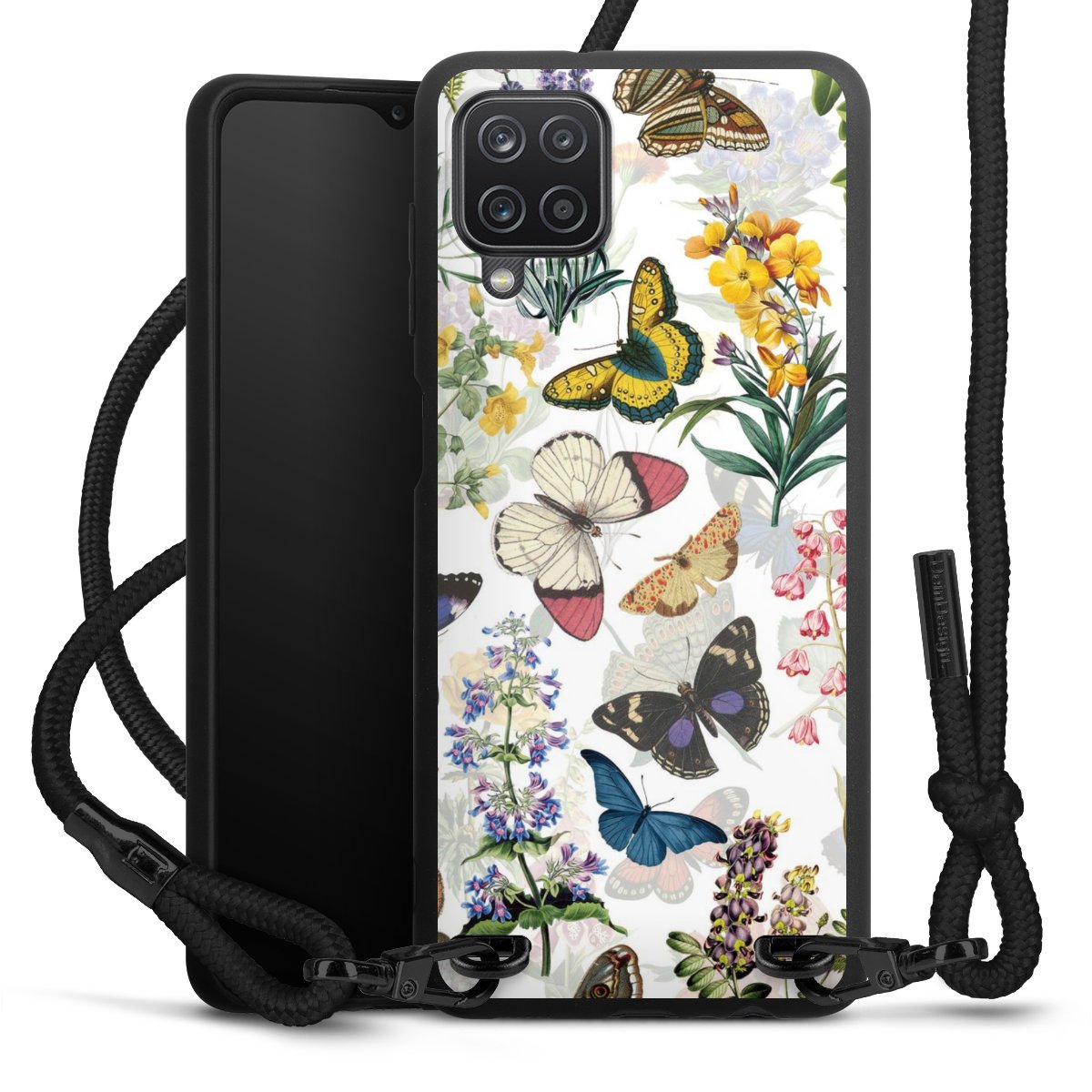 The matt black silicone case is made of flexible TPU (thermoplastic polyurethane) and offers robust protection. The durable, unbreakable material makes the cover flexible and dimensionally stable at the same time. The matte surface makes your design stand out more and is less susceptible to fingerprints and dirt. The stylish trend accessory fits comfortably in the hand and is perfectly complemented by the fabric (polyester) mobile phone strap. The braided fabric strap is approx. 1.70 metres long with a diameter of approx. 0.5 cm. Due to the special knotting technique, the length of the strap can be adjusted by simply pulling it, so that you can adapt it individually to your wishes. The practical case to wear around your neck is available with the fabric strap in black. As a little icing on the cake, we have provided the strap with a chic metal fastener in matt black. The strap is securely fastened to the case with loops made of high-quality genuine leather and press studs. The ends of the fabric strap are covered with metallic end caps and thus protected from fraying.