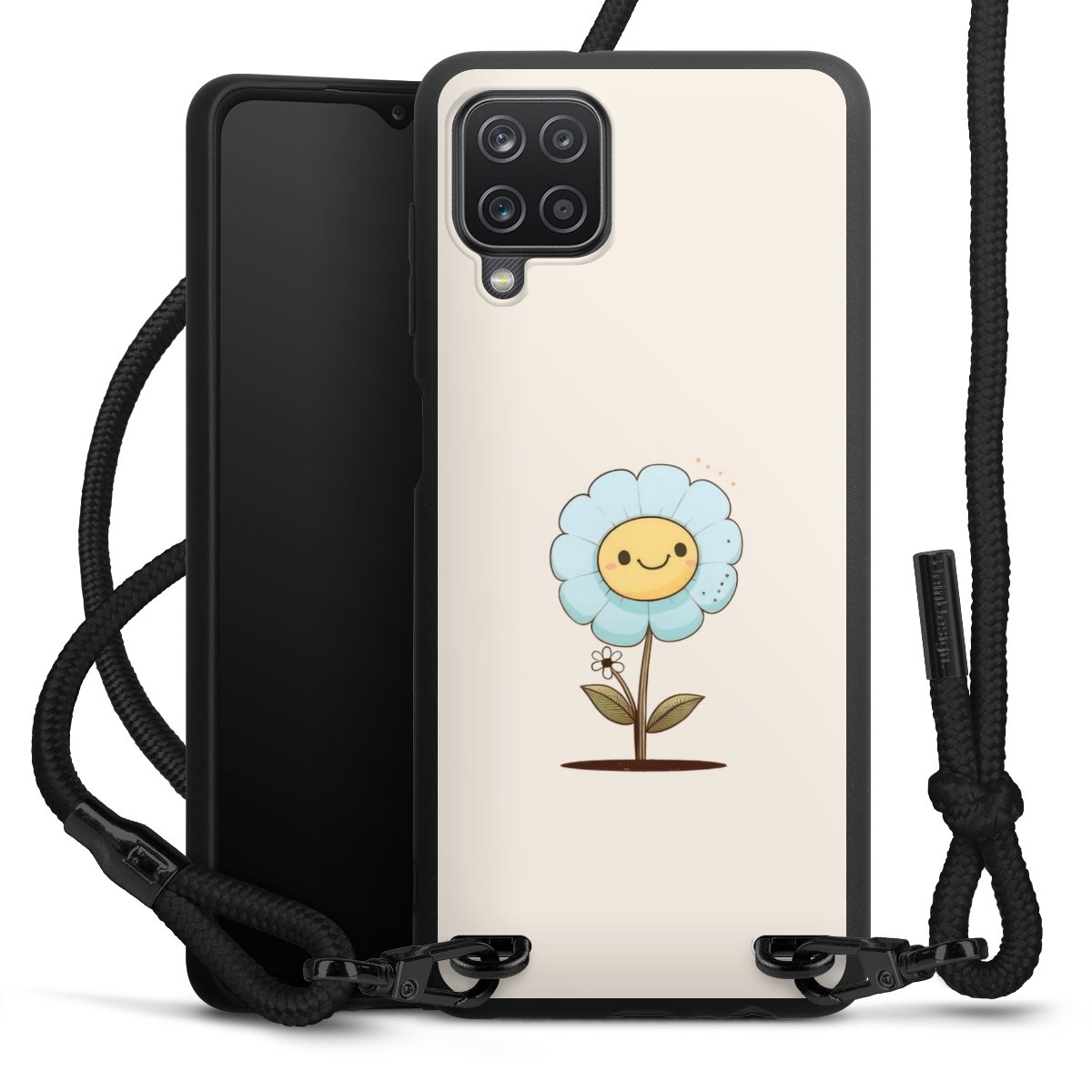The matt black silicone case is made of flexible TPU (thermoplastic polyurethane) and offers robust protection. The durable, unbreakable material makes the cover flexible and dimensionally stable at the same time. The matte surface makes your design stand out more and is less susceptible to fingerprints and dirt. The stylish trend accessory fits comfortably in the hand and is perfectly complemented by the fabric (polyester) mobile phone strap. The braided fabric strap is approx. 1.70 metres long with a diameter of approx. 0.5 cm. Due to the special knotting technique, the length of the strap can be adjusted by simply pulling it, so that you can adapt it individually to your wishes. The practical case to wear around your neck is available with the fabric strap in black. As a little icing on the cake, we have provided the strap with a chic metal fastener in matt black. The strap is securely fastened to the case with loops made of high-quality genuine leather and press studs. The ends of the fabric strap are covered with metallic end caps and thus protected from fraying.