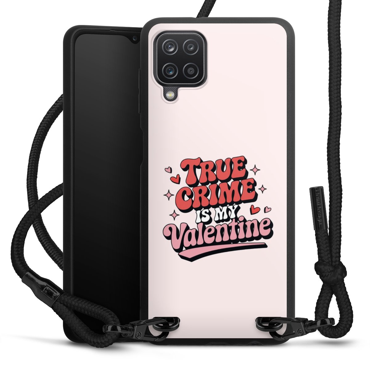 The matt black silicone case is made of flexible TPU (thermoplastic polyurethane) and offers robust protection. The durable, unbreakable material makes the cover flexible and dimensionally stable at the same time. The matte surface makes your design stand out more and is less susceptible to fingerprints and dirt. The stylish trend accessory fits comfortably in the hand and is perfectly complemented by the fabric (polyester) mobile phone strap. The braided fabric strap is approx. 1.70 metres long with a diameter of approx. 0.5 cm. Due to the special knotting technique, the length of the strap can be adjusted by simply pulling it, so that you can adapt it individually to your wishes. The practical case to wear around your neck is available with the fabric strap in black. As a little icing on the cake, we have provided the strap with a chic metal fastener in matt black. The strap is securely fastened to the case with loops made of high-quality genuine leather and press studs. The ends of the fabric strap are covered with metallic end caps and thus protected from fraying.
