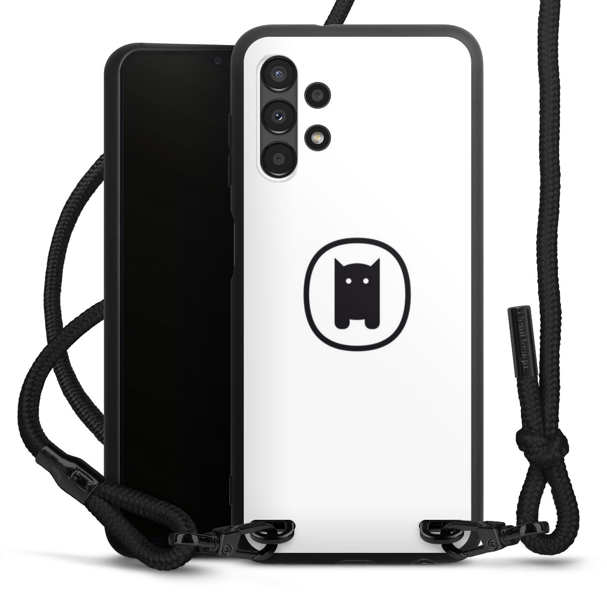 The matt black silicone case is made of flexible TPU (thermoplastic polyurethane) and offers robust protection. The durable, unbreakable material makes the cover flexible and dimensionally stable at the same time. The matte surface makes your design stand out more and is less susceptible to fingerprints and dirt. The stylish trend accessory fits comfortably in the hand and is perfectly complemented by the fabric (polyester) mobile phone strap. The braided fabric strap is approx. 1.70 metres long with a diameter of approx. 0.5 cm. Due to the special knotting technique, the length of the strap can be adjusted by simply pulling it, so that you can adapt it individually to your wishes. The practical case to wear around your neck is available with the fabric strap in black. As a little icing on the cake, we have provided the strap with a chic metal fastener in matt black. The strap is securely fastened to the case with loops made of high-quality genuine leather and press studs. The ends of the fabric strap are covered with metallic end caps and thus protected from fraying.