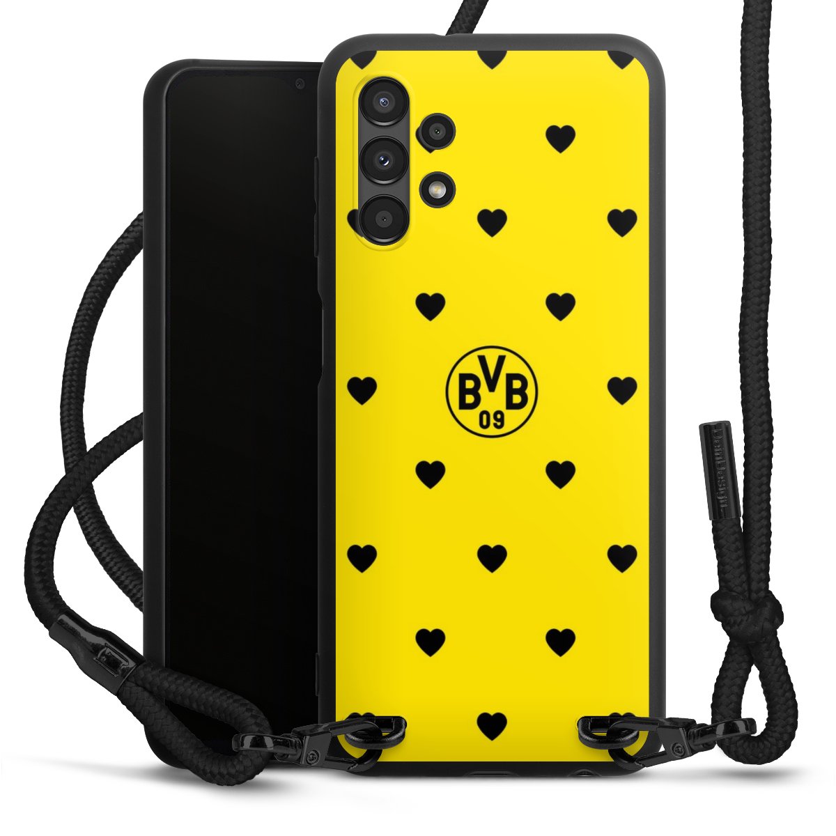 The matt black silicone case is made of flexible TPU (thermoplastic polyurethane) and offers robust protection. The durable, unbreakable material makes the cover flexible and dimensionally stable at the same time. The matte surface makes your design stand out more and is less susceptible to fingerprints and dirt. The stylish trend accessory fits comfortably in the hand and is perfectly complemented by the fabric (polyester) mobile phone strap. The braided fabric strap is approx. 1.70 metres long with a diameter of approx. 0.5 cm. Due to the special knotting technique, the length of the strap can be adjusted by simply pulling it, so that you can adapt it individually to your wishes. The practical case to wear around your neck is available with the fabric strap in black. As a little icing on the cake, we have provided the strap with a chic metal fastener in matt black. The strap is securely fastened to the case with loops made of high-quality genuine leather and press studs. The ends of the fabric strap are covered with metallic end caps and thus protected from fraying.