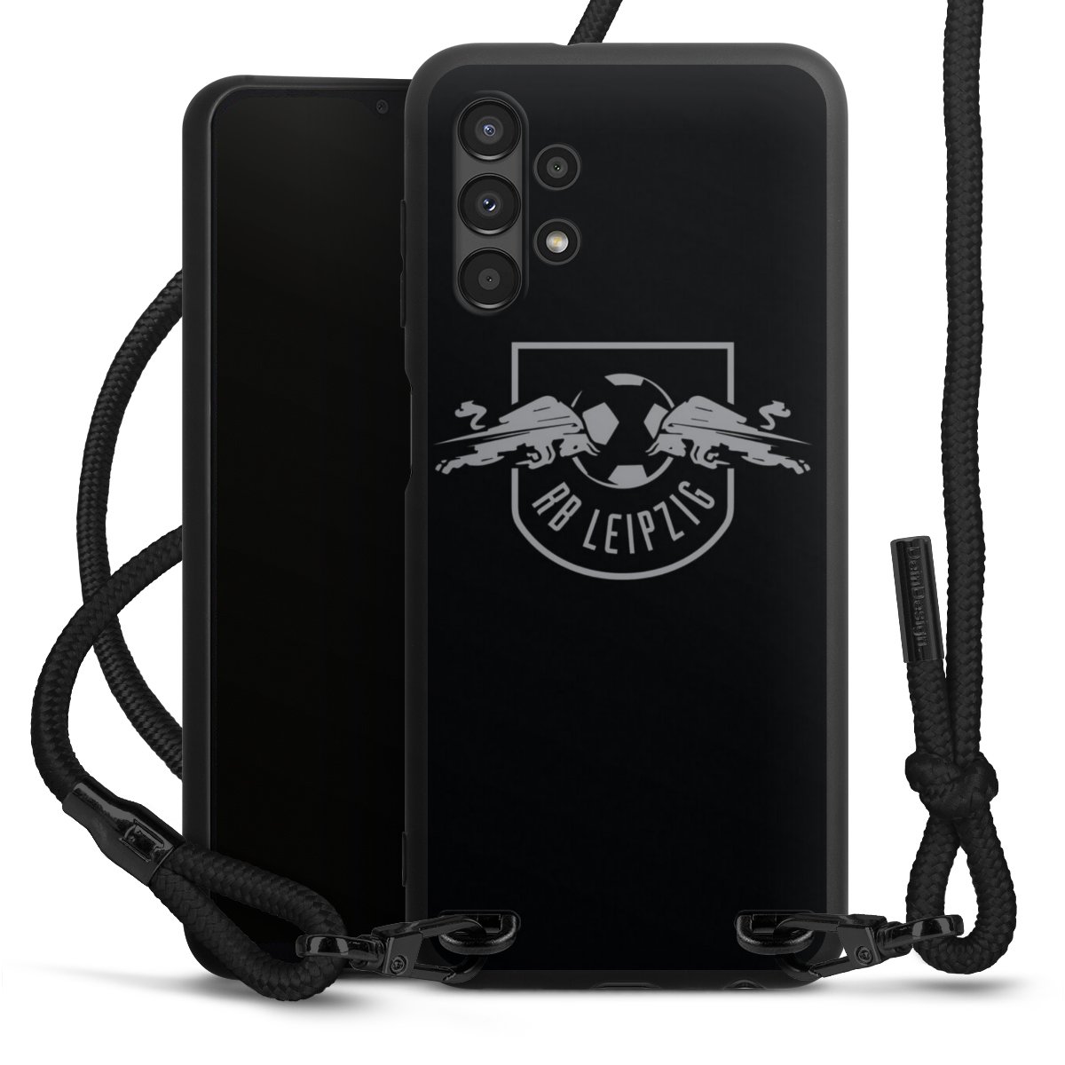The matt black silicone case is made of flexible TPU (thermoplastic polyurethane) and offers robust protection. The durable, unbreakable material makes the cover flexible and dimensionally stable at the same time. The matte surface makes your design stand out more and is less susceptible to fingerprints and dirt. The stylish trend accessory fits comfortably in the hand and is perfectly complemented by the fabric (polyester) mobile phone strap. The braided fabric strap is approx. 1.70 metres long with a diameter of approx. 0.5 cm. Due to the special knotting technique, the length of the strap can be adjusted by simply pulling it, so that you can adapt it individually to your wishes. The practical case to wear around your neck is available with the fabric strap in black. As a little icing on the cake, we have provided the strap with a chic metal fastener in matt black. The strap is securely fastened to the case with loops made of high-quality genuine leather and press studs. The ends of the fabric strap are covered with metallic end caps and thus protected from fraying.
