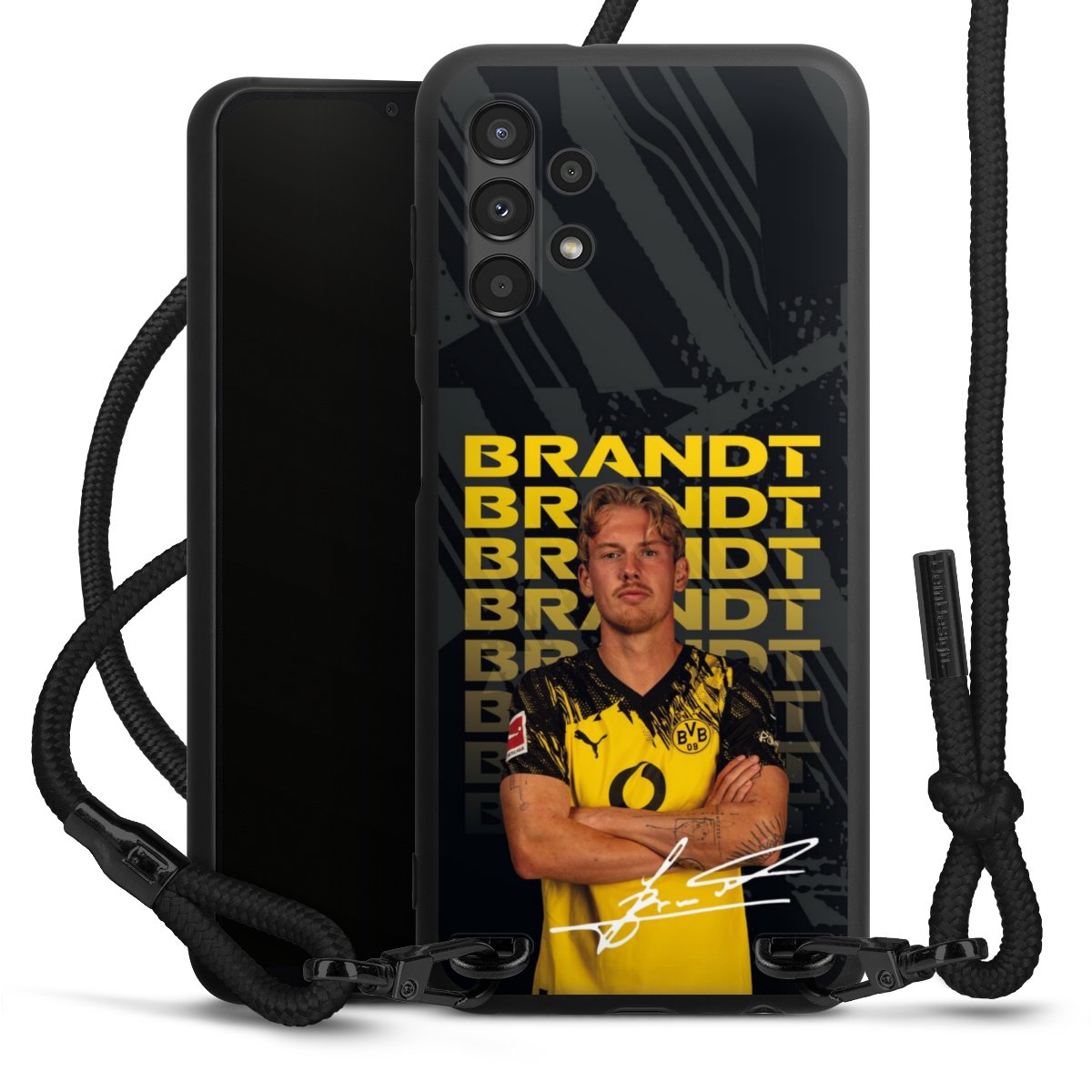 The matt black silicone case is made of flexible TPU (thermoplastic polyurethane) and offers robust protection. The durable, unbreakable material makes the cover flexible and dimensionally stable at the same time. The matte surface makes your design stand out more and is less susceptible to fingerprints and dirt. The stylish trend accessory fits comfortably in the hand and is perfectly complemented by the fabric (polyester) mobile phone strap. The braided fabric strap is approx. 1.70 metres long with a diameter of approx. 0.5 cm. Due to the special knotting technique, the length of the strap can be adjusted by simply pulling it, so that you can adapt it individually to your wishes. The practical case to wear around your neck is available with the fabric strap in black. As a little icing on the cake, we have provided the strap with a chic metal fastener in matt black. The strap is securely fastened to the case with loops made of high-quality genuine leather and press studs. The ends of the fabric strap are covered with metallic end caps and thus protected from fraying.