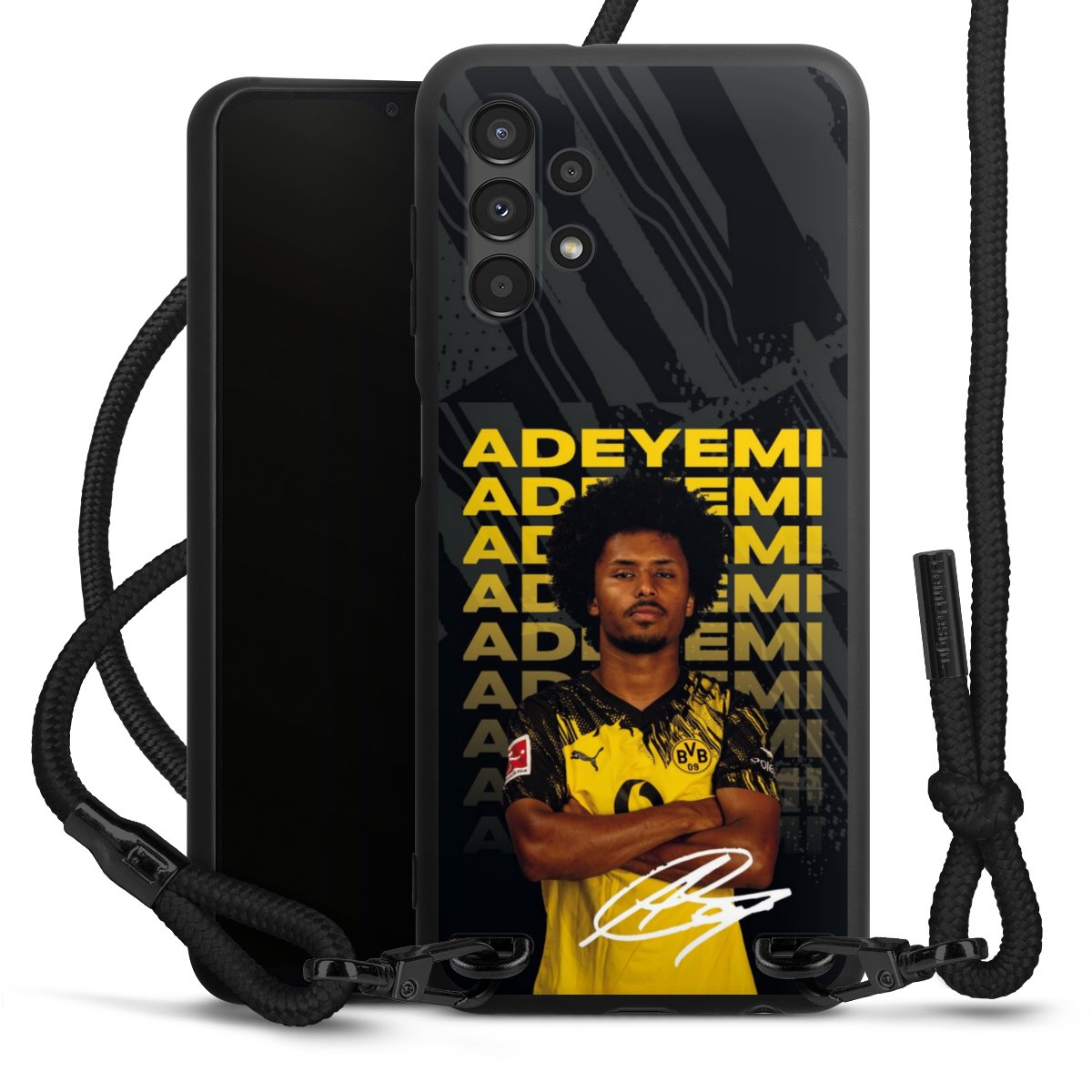 The matt black silicone case is made of flexible TPU (thermoplastic polyurethane) and offers robust protection. The durable, unbreakable material makes the cover flexible and dimensionally stable at the same time. The matte surface makes your design stand out more and is less susceptible to fingerprints and dirt. The stylish trend accessory fits comfortably in the hand and is perfectly complemented by the fabric (polyester) mobile phone strap. The braided fabric strap is approx. 1.70 metres long with a diameter of approx. 0.5 cm. Due to the special knotting technique, the length of the strap can be adjusted by simply pulling it, so that you can adapt it individually to your wishes. The practical case to wear around your neck is available with the fabric strap in black. As a little icing on the cake, we have provided the strap with a chic metal fastener in matt black. The strap is securely fastened to the case with loops made of high-quality genuine leather and press studs. The ends of the fabric strap are covered with metallic end caps and thus protected from fraying.