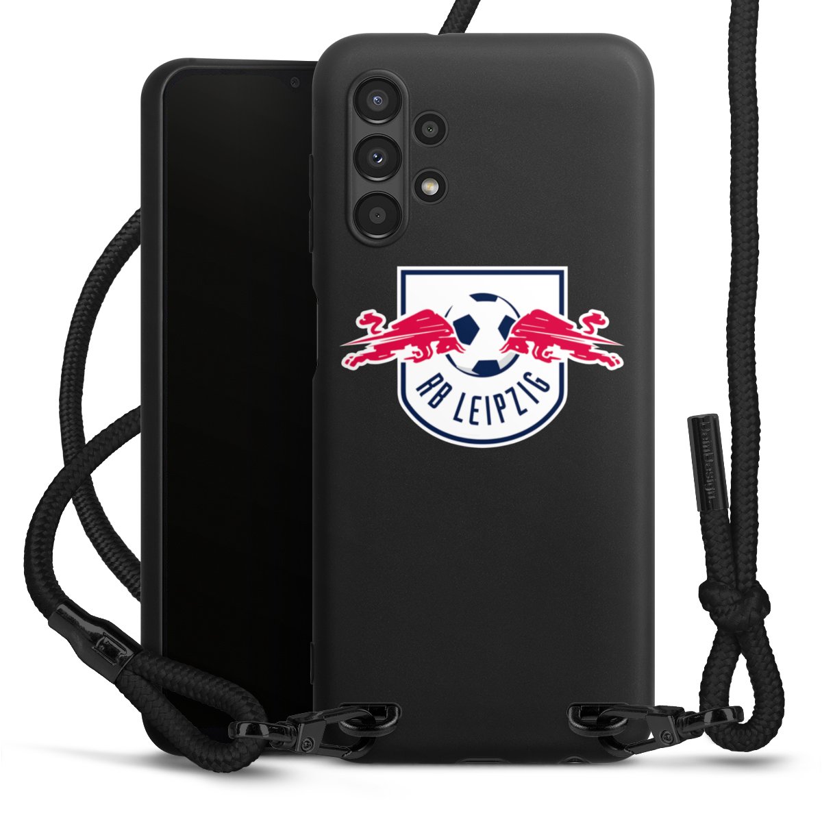The matt black silicone case is made of flexible TPU (thermoplastic polyurethane) and offers robust protection. The durable, unbreakable material makes the cover flexible and dimensionally stable at the same time. The matte surface makes your design stand out more and is less susceptible to fingerprints and dirt. The stylish trend accessory fits comfortably in the hand and is perfectly complemented by the fabric (polyester) mobile phone strap. The braided fabric strap is approx. 1.70 metres long with a diameter of approx. 0.5 cm. Due to the special knotting technique, the length of the strap can be adjusted by simply pulling it, so that you can adapt it individually to your wishes. The practical case to wear around your neck is available with the fabric strap in black. As a little icing on the cake, we have provided the strap with a chic metal fastener in matt black. The strap is securely fastened to the case with loops made of high-quality genuine leather and press studs. The ends of the fabric strap are covered with metallic end caps and thus protected from fraying.