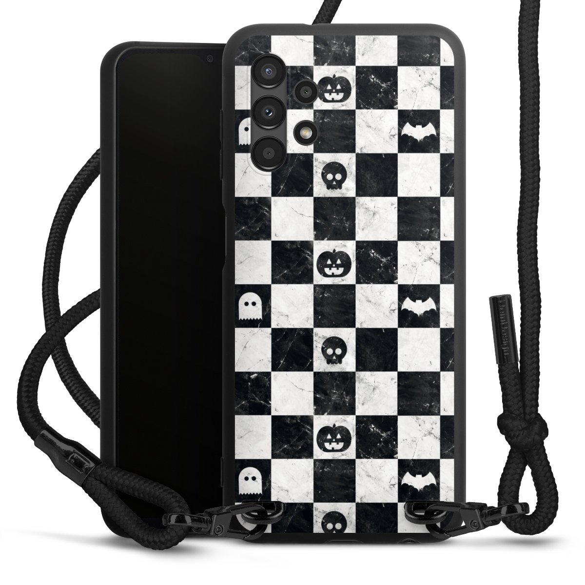 The matt black silicone case is made of flexible TPU (thermoplastic polyurethane) and offers robust protection. The durable, unbreakable material makes the cover flexible and dimensionally stable at the same time. The matte surface makes your design stand out more and is less susceptible to fingerprints and dirt. The stylish trend accessory fits comfortably in the hand and is perfectly complemented by the fabric (polyester) mobile phone strap. The braided fabric strap is approx. 1.70 metres long with a diameter of approx. 0.5 cm. Due to the special knotting technique, the length of the strap can be adjusted by simply pulling it, so that you can adapt it individually to your wishes. The practical case to wear around your neck is available with the fabric strap in black. As a little icing on the cake, we have provided the strap with a chic metal fastener in matt black. The strap is securely fastened to the case with loops made of high-quality genuine leather and press studs. The ends of the fabric strap are covered with metallic end caps and thus protected from fraying.