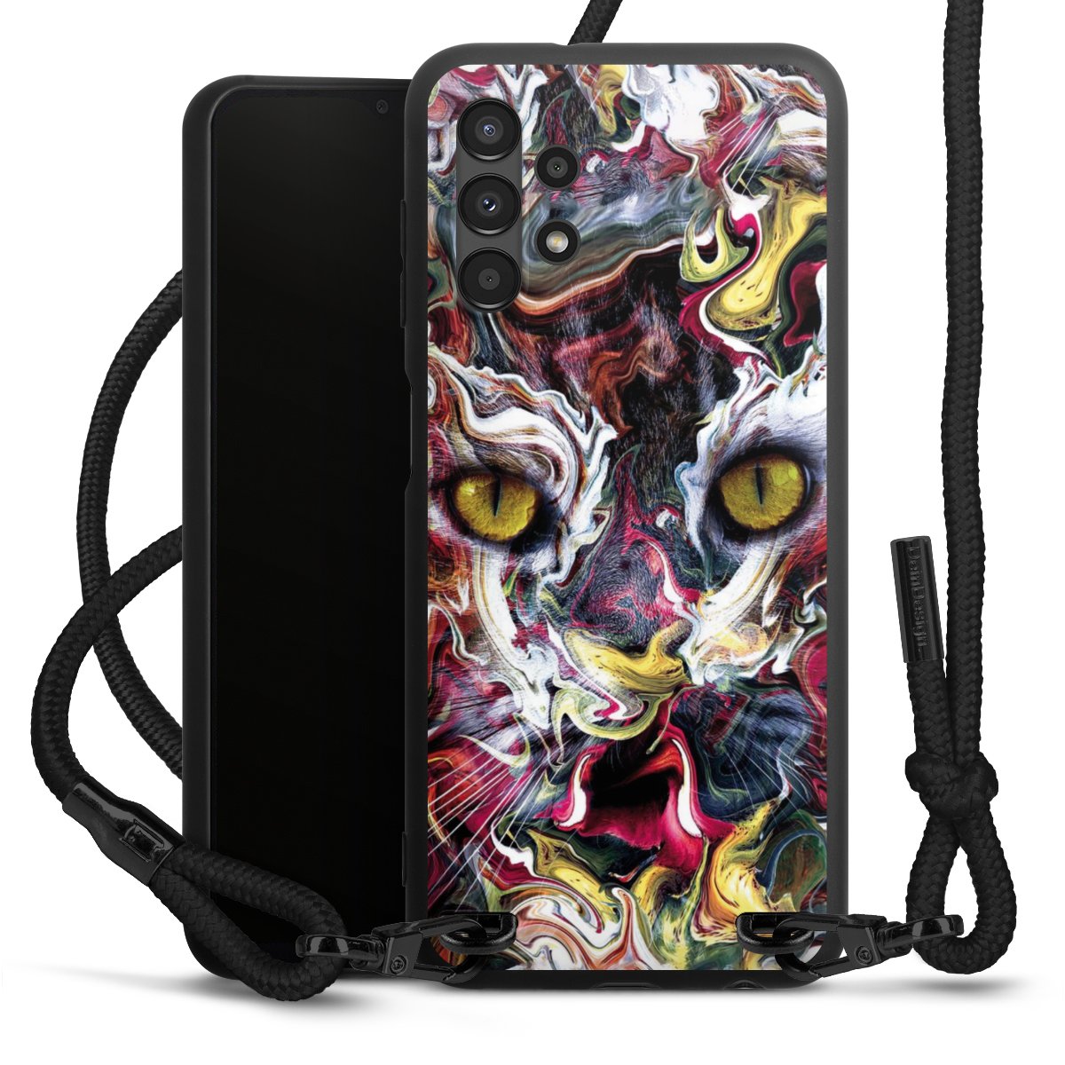 The matt black silicone case is made of flexible TPU (thermoplastic polyurethane) and offers robust protection. The durable, unbreakable material makes the cover flexible and dimensionally stable at the same time. The matte surface makes your design stand out more and is less susceptible to fingerprints and dirt. The stylish trend accessory fits comfortably in the hand and is perfectly complemented by the fabric (polyester) mobile phone strap. The braided fabric strap is approx. 1.70 metres long with a diameter of approx. 0.5 cm. Due to the special knotting technique, the length of the strap can be adjusted by simply pulling it, so that you can adapt it individually to your wishes. The practical case to wear around your neck is available with the fabric strap in black. As a little icing on the cake, we have provided the strap with a chic metal fastener in matt black. The strap is securely fastened to the case with loops made of high-quality genuine leather and press studs. The ends of the fabric strap are covered with metallic end caps and thus protected from fraying.