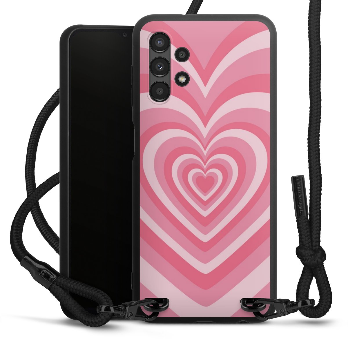 The matt black silicone case is made of flexible TPU (thermoplastic polyurethane) and offers robust protection. The durable, unbreakable material makes the cover flexible and dimensionally stable at the same time. The matte surface makes your design stand out more and is less susceptible to fingerprints and dirt. The stylish trend accessory fits comfortably in the hand and is perfectly complemented by the fabric (polyester) mobile phone strap. The braided fabric strap is approx. 1.70 metres long with a diameter of approx. 0.5 cm. Due to the special knotting technique, the length of the strap can be adjusted by simply pulling it, so that you can adapt it individually to your wishes. The practical case to wear around your neck is available with the fabric strap in black. As a little icing on the cake, we have provided the strap with a chic metal fastener in matt black. The strap is securely fastened to the case with loops made of high-quality genuine leather and press studs. The ends of the fabric strap are covered with metallic end caps and thus protected from fraying.