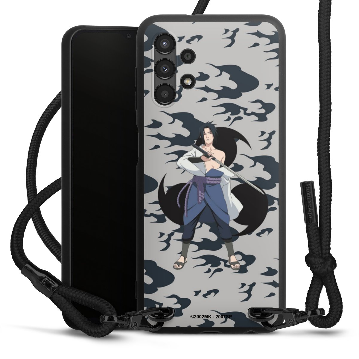 The matt black silicone case is made of flexible TPU (thermoplastic polyurethane) and offers robust protection. The durable, unbreakable material makes the cover flexible and dimensionally stable at the same time. The matte surface makes your design stand out more and is less susceptible to fingerprints and dirt. The stylish trend accessory fits comfortably in the hand and is perfectly complemented by the fabric (polyester) mobile phone strap. The braided fabric strap is approx. 1.70 metres long with a diameter of approx. 0.5 cm. Due to the special knotting technique, the length of the strap can be adjusted by simply pulling it, so that you can adapt it individually to your wishes. The practical case to wear around your neck is available with the fabric strap in black. As a little icing on the cake, we have provided the strap with a chic metal fastener in matt black. The strap is securely fastened to the case with loops made of high-quality genuine leather and press studs. The ends of the fabric strap are covered with metallic end caps and thus protected from fraying.