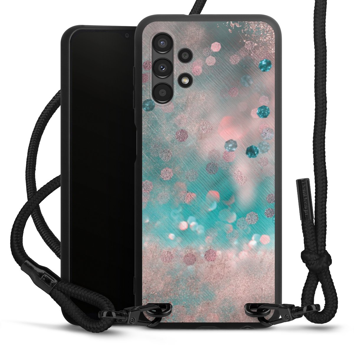 The matt black silicone case is made of flexible TPU (thermoplastic polyurethane) and offers robust protection. The durable, unbreakable material makes the cover flexible and dimensionally stable at the same time. The matte surface makes your design stand out more and is less susceptible to fingerprints and dirt. The stylish trend accessory fits comfortably in the hand and is perfectly complemented by the fabric (polyester) mobile phone strap. The braided fabric strap is approx. 1.70 metres long with a diameter of approx. 0.5 cm. Due to the special knotting technique, the length of the strap can be adjusted by simply pulling it, so that you can adapt it individually to your wishes. The practical case to wear around your neck is available with the fabric strap in black. As a little icing on the cake, we have provided the strap with a chic metal fastener in matt black. The strap is securely fastened to the case with loops made of high-quality genuine leather and press studs. The ends of the fabric strap are covered with metallic end caps and thus protected from fraying.
