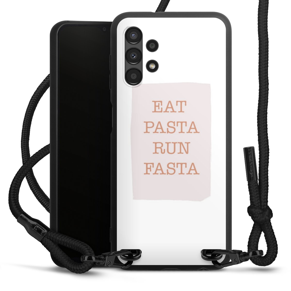 The matt black silicone case is made of flexible TPU (thermoplastic polyurethane) and offers robust protection. The durable, unbreakable material makes the cover flexible and dimensionally stable at the same time. The matte surface makes your design stand out more and is less susceptible to fingerprints and dirt. The stylish trend accessory fits comfortably in the hand and is perfectly complemented by the fabric (polyester) mobile phone strap. The braided fabric strap is approx. 1.70 metres long with a diameter of approx. 0.5 cm. Due to the special knotting technique, the length of the strap can be adjusted by simply pulling it, so that you can adapt it individually to your wishes. The practical case to wear around your neck is available with the fabric strap in black. As a little icing on the cake, we have provided the strap with a chic metal fastener in matt black. The strap is securely fastened to the case with loops made of high-quality genuine leather and press studs. The ends of the fabric strap are covered with metallic end caps and thus protected from fraying.