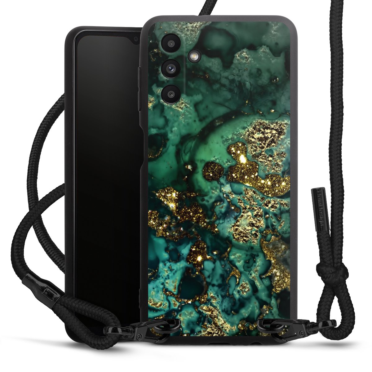 The matt black silicone case is made of flexible TPU (thermoplastic polyurethane) and offers robust protection. The durable, unbreakable material makes the cover flexible and dimensionally stable at the same time. The matte surface makes your design stand out more and is less susceptible to fingerprints and dirt. The stylish trend accessory fits comfortably in the hand and is perfectly complemented by the fabric (polyester) mobile phone strap. The braided fabric strap is approx. 1.70 metres long with a diameter of approx. 0.5 cm. Due to the special knotting technique, the length of the strap can be adjusted by simply pulling it, so that you can adapt it individually to your wishes. The practical case to wear around your neck is available with the fabric strap in black. As a little icing on the cake, we have provided the strap with a chic metal fastener in matt black. The strap is securely fastened to the case with loops made of high-quality genuine leather and press studs. The ends of the fabric strap are covered with metallic end caps and thus protected from fraying.
