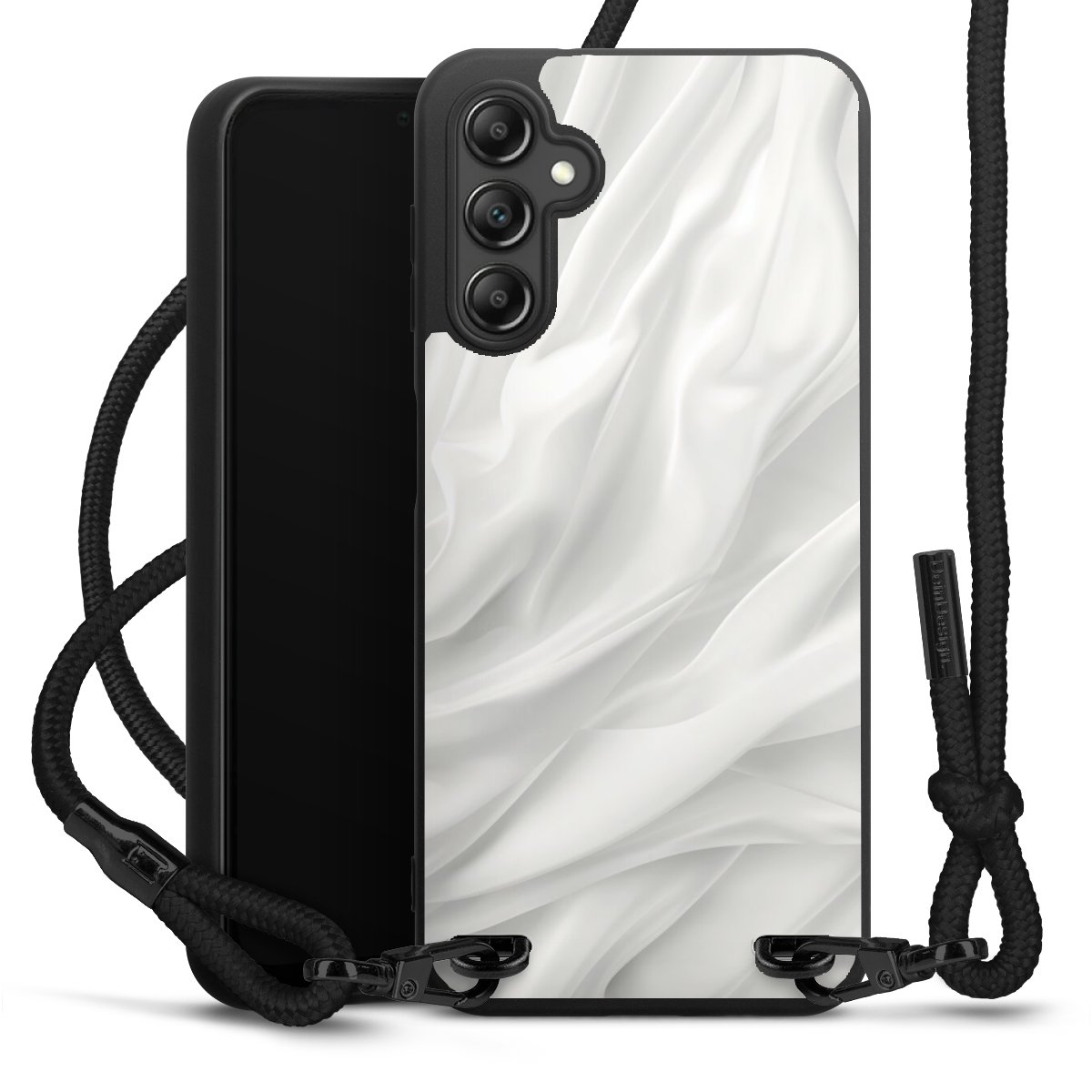 The matt black silicone case is made of flexible TPU (thermoplastic polyurethane) and offers robust protection. The durable, unbreakable material makes the cover flexible and dimensionally stable at the same time. The matte surface makes your design stand out more and is less susceptible to fingerprints and dirt. The stylish trend accessory fits comfortably in the hand and is perfectly complemented by the fabric (polyester) mobile phone strap. The braided fabric strap is approx. 1.70 metres long with a diameter of approx. 0.5 cm. Due to the special knotting technique, the length of the strap can be adjusted by simply pulling it, so that you can adapt it individually to your wishes. The practical case to wear around your neck is available with the fabric strap in black. As a little icing on the cake, we have provided the strap with a chic metal fastener in matt black. The strap is securely fastened to the case with loops made of high-quality genuine leather and press studs. The ends of the fabric strap are covered with metallic end caps and thus protected from fraying.