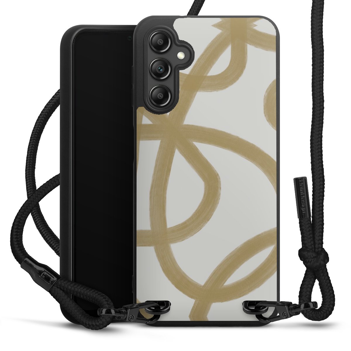 The matt black silicone case is made of flexible TPU (thermoplastic polyurethane) and offers robust protection. The durable, unbreakable material makes the cover flexible and dimensionally stable at the same time. The matte surface makes your design stand out more and is less susceptible to fingerprints and dirt. The stylish trend accessory fits comfortably in the hand and is perfectly complemented by the fabric (polyester) mobile phone strap. The braided fabric strap is approx. 1.70 metres long with a diameter of approx. 0.5 cm. Due to the special knotting technique, the length of the strap can be adjusted by simply pulling it, so that you can adapt it individually to your wishes. The practical case to wear around your neck is available with the fabric strap in black. As a little icing on the cake, we have provided the strap with a chic metal fastener in matt black. The strap is securely fastened to the case with loops made of high-quality genuine leather and press studs. The ends of the fabric strap are covered with metallic end caps and thus protected from fraying.