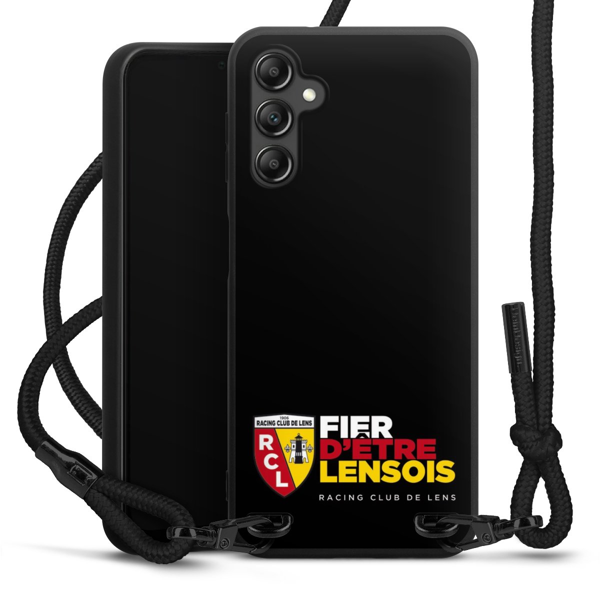 The matt black silicone case is made of flexible TPU (thermoplastic polyurethane) and offers robust protection. The durable, unbreakable material makes the cover flexible and dimensionally stable at the same time. The matte surface makes your design stand out more and is less susceptible to fingerprints and dirt. The stylish trend accessory fits comfortably in the hand and is perfectly complemented by the fabric (polyester) mobile phone strap. The braided fabric strap is approx. 1.70 metres long with a diameter of approx. 0.5 cm. Due to the special knotting technique, the length of the strap can be adjusted by simply pulling it, so that you can adapt it individually to your wishes. The practical case to wear around your neck is available with the fabric strap in black. As a little icing on the cake, we have provided the strap with a chic metal fastener in matt black. The strap is securely fastened to the case with loops made of high-quality genuine leather and press studs. The ends of the fabric strap are covered with metallic end caps and thus protected from fraying.