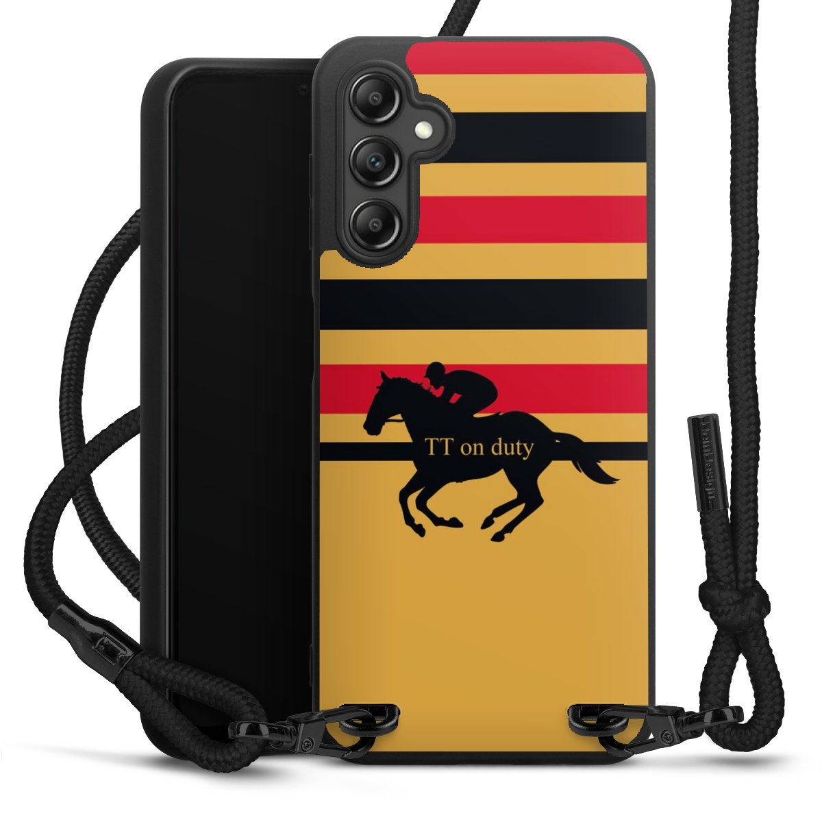 The matt black silicone case is made of flexible TPU (thermoplastic polyurethane) and offers robust protection. The durable, unbreakable material makes the cover flexible and dimensionally stable at the same time. The matte surface makes your design stand out more and is less susceptible to fingerprints and dirt. The stylish trend accessory fits comfortably in the hand and is perfectly complemented by the fabric (polyester) mobile phone strap. The braided fabric strap is approx. 1.70 metres long with a diameter of approx. 0.5 cm. Due to the special knotting technique, the length of the strap can be adjusted by simply pulling it, so that you can adapt it individually to your wishes. The practical case to wear around your neck is available with the fabric strap in black. As a little icing on the cake, we have provided the strap with a chic metal fastener in matt black. The strap is securely fastened to the case with loops made of high-quality genuine leather and press studs. The ends of the fabric strap are covered with metallic end caps and thus protected from fraying.