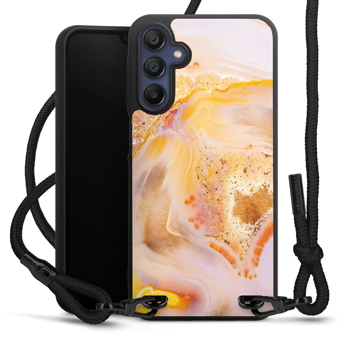 The matt black silicone case is made of flexible TPU (thermoplastic polyurethane) and offers robust protection. The durable, unbreakable material makes the cover flexible and dimensionally stable at the same time. The matte surface makes your design stand out more and is less susceptible to fingerprints and dirt. The stylish trend accessory fits comfortably in the hand and is perfectly complemented by the fabric (polyester) mobile phone strap. The braided fabric strap is approx. 1.70 metres long with a diameter of approx. 0.5 cm. Due to the special knotting technique, the length of the strap can be adjusted by simply pulling it, so that you can adapt it individually to your wishes. The practical case to wear around your neck is available with the fabric strap in black. As a little icing on the cake, we have provided the strap with a chic metal fastener in matt black. The strap is securely fastened to the case with loops made of high-quality genuine leather and press studs. The ends of the fabric strap are covered with metallic end caps and thus protected from fraying.