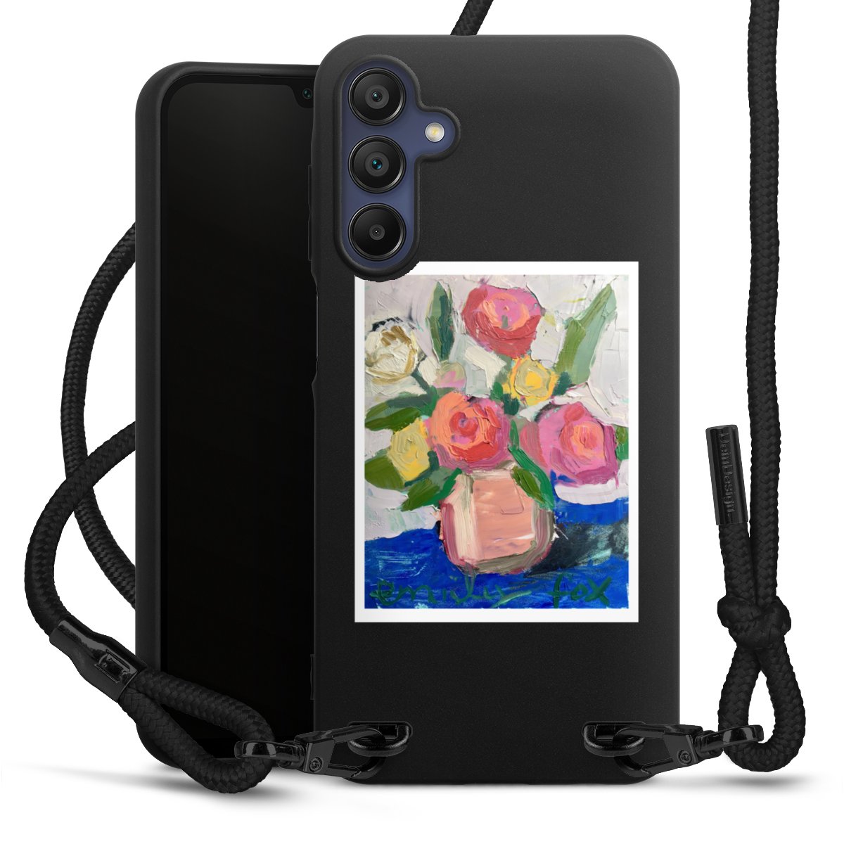 The matt black silicone case is made of flexible TPU (thermoplastic polyurethane) and offers robust protection. The durable, unbreakable material makes the cover flexible and dimensionally stable at the same time. The matte surface makes your design stand out more and is less susceptible to fingerprints and dirt. The stylish trend accessory fits comfortably in the hand and is perfectly complemented by the fabric (polyester) mobile phone strap. The braided fabric strap is approx. 1.70 metres long with a diameter of approx. 0.5 cm. Due to the special knotting technique, the length of the strap can be adjusted by simply pulling it, so that you can adapt it individually to your wishes. The practical case to wear around your neck is available with the fabric strap in black. As a little icing on the cake, we have provided the strap with a chic metal fastener in matt black. The strap is securely fastened to the case with loops made of high-quality genuine leather and press studs. The ends of the fabric strap are covered with metallic end caps and thus protected from fraying.