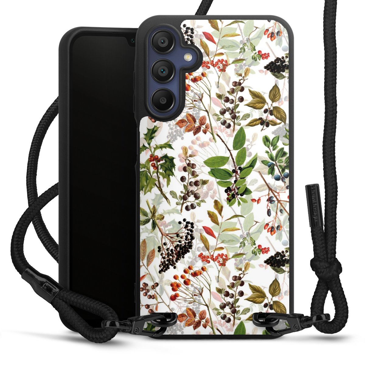 The matt black silicone case is made of flexible TPU (thermoplastic polyurethane) and offers robust protection. The durable, unbreakable material makes the cover flexible and dimensionally stable at the same time. The matte surface makes your design stand out more and is less susceptible to fingerprints and dirt. The stylish trend accessory fits comfortably in the hand and is perfectly complemented by the fabric (polyester) mobile phone strap. The braided fabric strap is approx. 1.70 metres long with a diameter of approx. 0.5 cm. Due to the special knotting technique, the length of the strap can be adjusted by simply pulling it, so that you can adapt it individually to your wishes. The practical case to wear around your neck is available with the fabric strap in black. As a little icing on the cake, we have provided the strap with a chic metal fastener in matt black. The strap is securely fastened to the case with loops made of high-quality genuine leather and press studs. The ends of the fabric strap are covered with metallic end caps and thus protected from fraying.