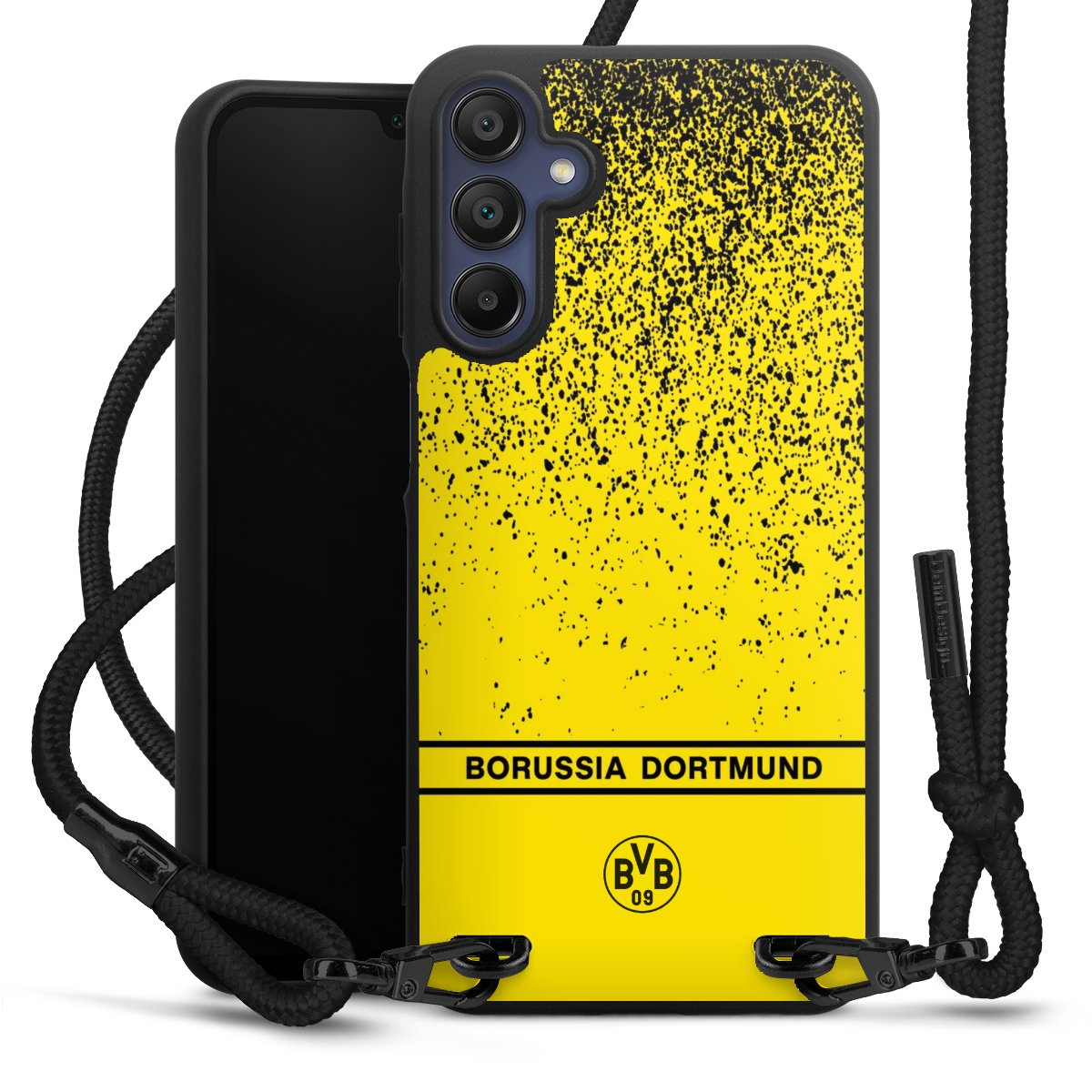 The matt black silicone case is made of flexible TPU (thermoplastic polyurethane) and offers robust protection. The durable, unbreakable material makes the cover flexible and dimensionally stable at the same time. The matte surface makes your design stand out more and is less susceptible to fingerprints and dirt. The stylish trend accessory fits comfortably in the hand and is perfectly complemented by the fabric (polyester) mobile phone strap. The braided fabric strap is approx. 1.70 metres long with a diameter of approx. 0.5 cm. Due to the special knotting technique, the length of the strap can be adjusted by simply pulling it, so that you can adapt it individually to your wishes. The practical case to wear around your neck is available with the fabric strap in black. As a little icing on the cake, we have provided the strap with a chic metal fastener in matt black. The strap is securely fastened to the case with loops made of high-quality genuine leather and press studs. The ends of the fabric strap are covered with metallic end caps and thus protected from fraying.