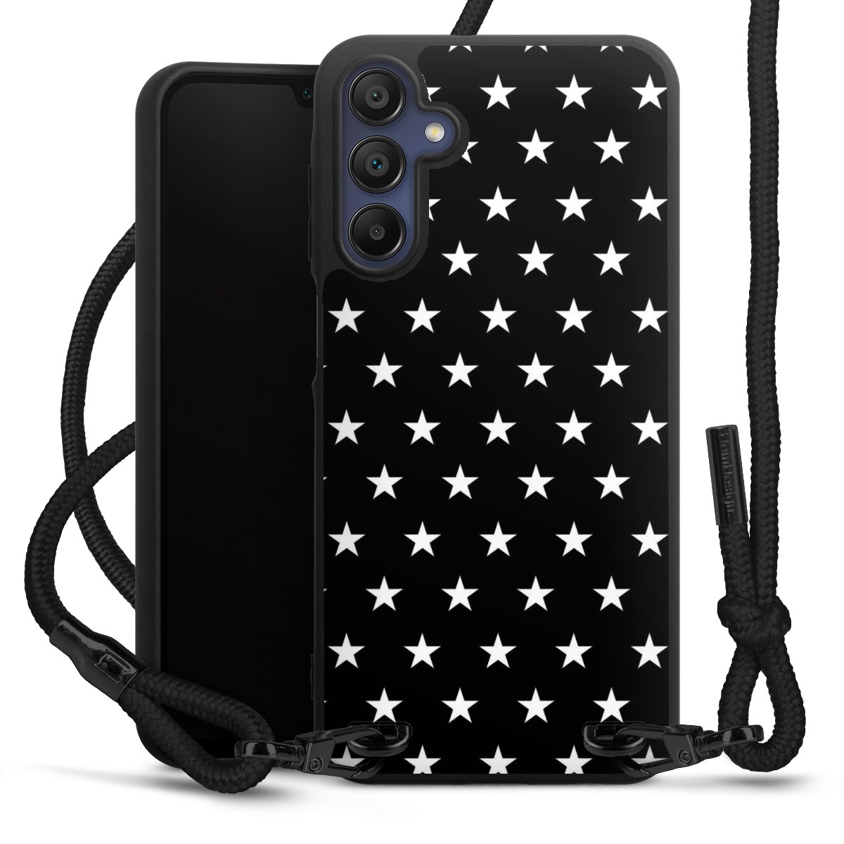 The matt black silicone case is made of flexible TPU (thermoplastic polyurethane) and offers robust protection. The durable, unbreakable material makes the cover flexible and dimensionally stable at the same time. The matte surface makes your design stand out more and is less susceptible to fingerprints and dirt. The stylish trend accessory fits comfortably in the hand and is perfectly complemented by the fabric (polyester) mobile phone strap. The braided fabric strap is approx. 1.70 metres long with a diameter of approx. 0.5 cm. Due to the special knotting technique, the length of the strap can be adjusted by simply pulling it, so that you can adapt it individually to your wishes. The practical case to wear around your neck is available with the fabric strap in black. As a little icing on the cake, we have provided the strap with a chic metal fastener in matt black. The strap is securely fastened to the case with loops made of high-quality genuine leather and press studs. The ends of the fabric strap are covered with metallic end caps and thus protected from fraying.
