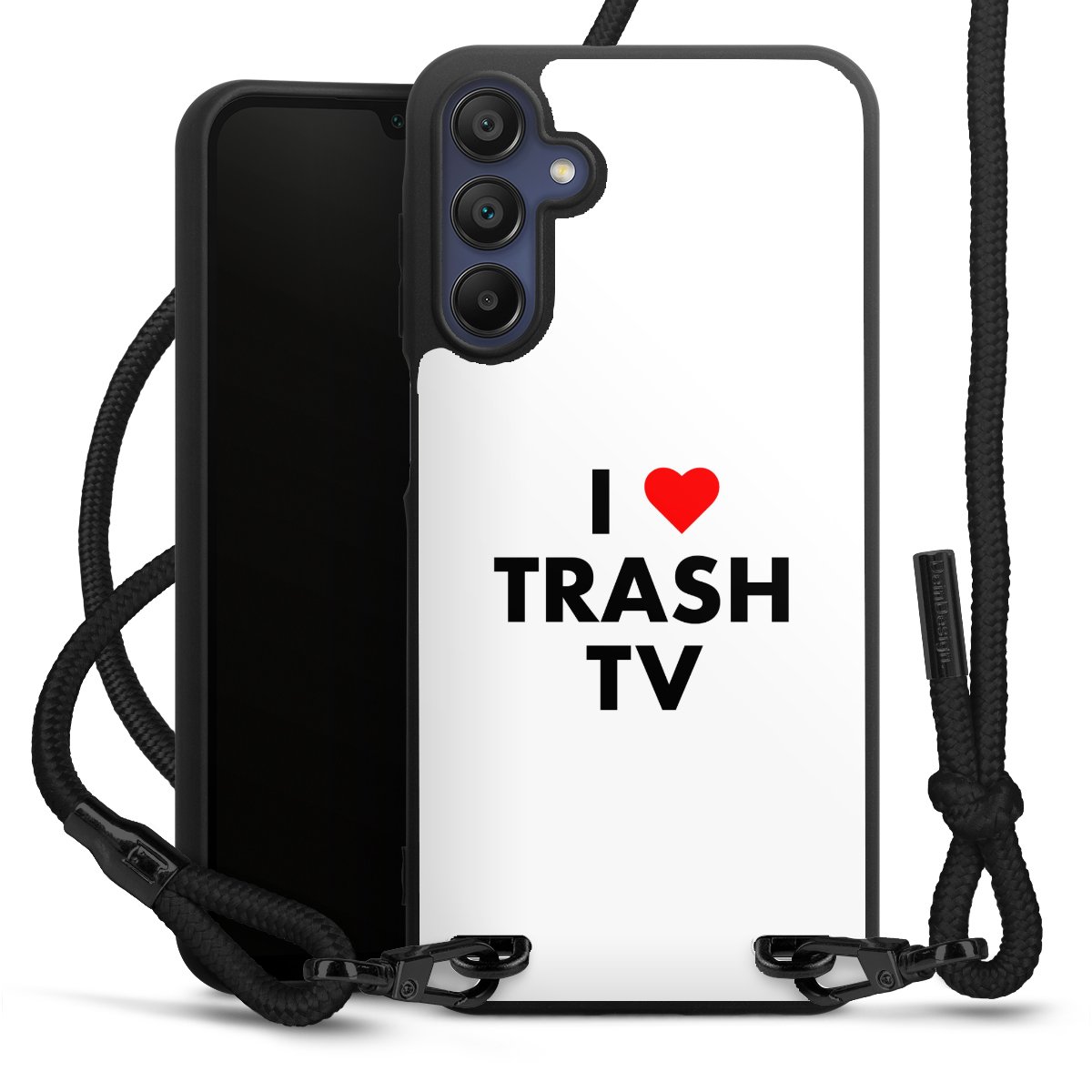 The matt black silicone case is made of flexible TPU (thermoplastic polyurethane) and offers robust protection. The durable, unbreakable material makes the cover flexible and dimensionally stable at the same time. The matte surface makes your design stand out more and is less susceptible to fingerprints and dirt. The stylish trend accessory fits comfortably in the hand and is perfectly complemented by the fabric (polyester) mobile phone strap. The braided fabric strap is approx. 1.70 metres long with a diameter of approx. 0.5 cm. Due to the special knotting technique, the length of the strap can be adjusted by simply pulling it, so that you can adapt it individually to your wishes. The practical case to wear around your neck is available with the fabric strap in black. As a little icing on the cake, we have provided the strap with a chic metal fastener in matt black. The strap is securely fastened to the case with loops made of high-quality genuine leather and press studs. The ends of the fabric strap are covered with metallic end caps and thus protected from fraying.