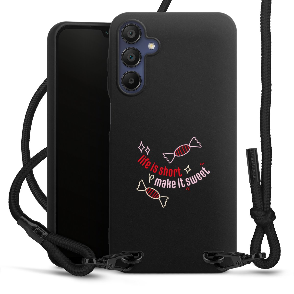 The matt black silicone case is made of flexible TPU (thermoplastic polyurethane) and offers robust protection. The durable, unbreakable material makes the cover flexible and dimensionally stable at the same time. The matte surface makes your design stand out more and is less susceptible to fingerprints and dirt. The stylish trend accessory fits comfortably in the hand and is perfectly complemented by the fabric (polyester) mobile phone strap. The braided fabric strap is approx. 1.70 metres long with a diameter of approx. 0.5 cm. Due to the special knotting technique, the length of the strap can be adjusted by simply pulling it, so that you can adapt it individually to your wishes. The practical case to wear around your neck is available with the fabric strap in black. As a little icing on the cake, we have provided the strap with a chic metal fastener in matt black. The strap is securely fastened to the case with loops made of high-quality genuine leather and press studs. The ends of the fabric strap are covered with metallic end caps and thus protected from fraying.