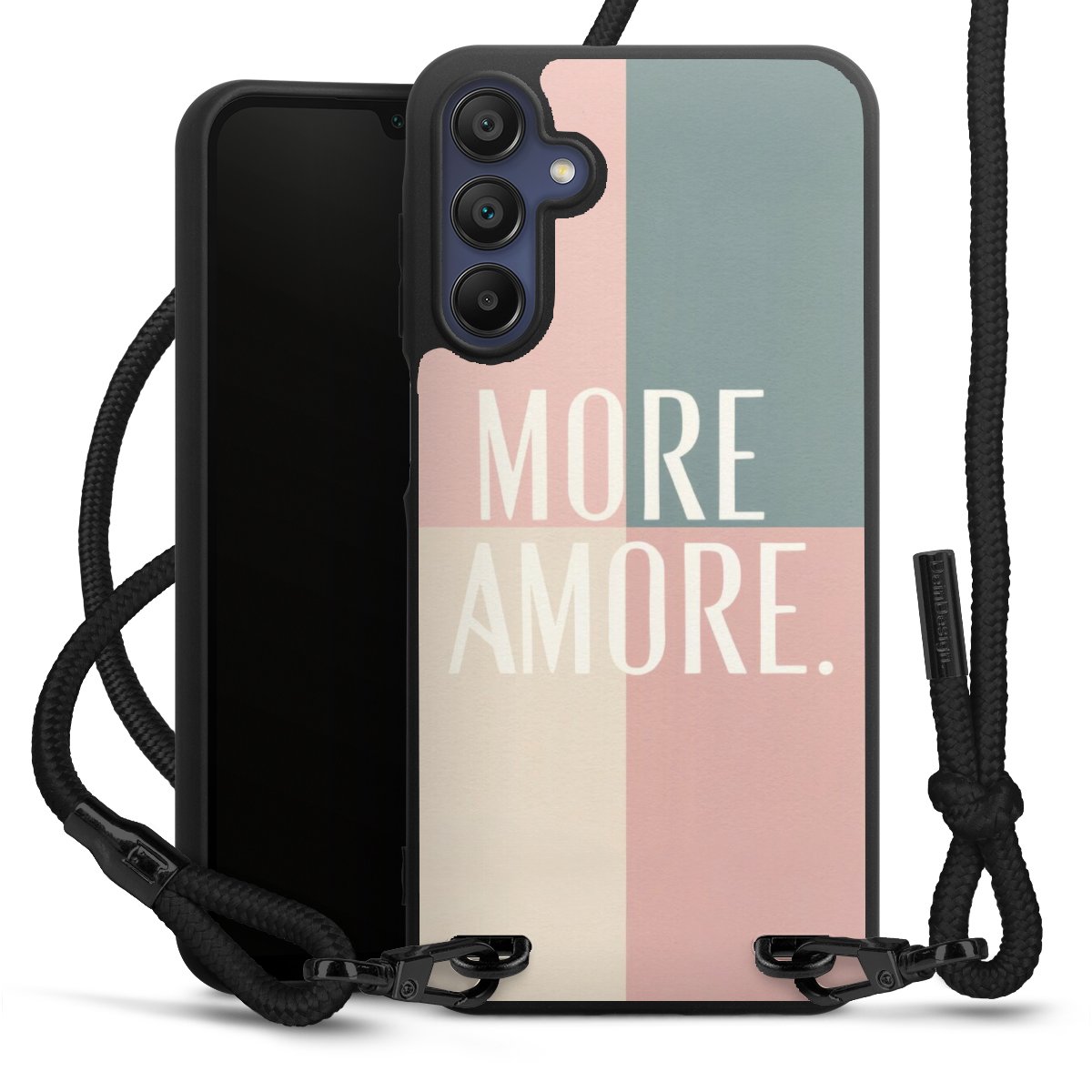 The matt black silicone case is made of flexible TPU (thermoplastic polyurethane) and offers robust protection. The durable, unbreakable material makes the cover flexible and dimensionally stable at the same time. The matte surface makes your design stand out more and is less susceptible to fingerprints and dirt. The stylish trend accessory fits comfortably in the hand and is perfectly complemented by the fabric (polyester) mobile phone strap. The braided fabric strap is approx. 1.70 metres long with a diameter of approx. 0.5 cm. Due to the special knotting technique, the length of the strap can be adjusted by simply pulling it, so that you can adapt it individually to your wishes. The practical case to wear around your neck is available with the fabric strap in black. As a little icing on the cake, we have provided the strap with a chic metal fastener in matt black. The strap is securely fastened to the case with loops made of high-quality genuine leather and press studs. The ends of the fabric strap are covered with metallic end caps and thus protected from fraying.