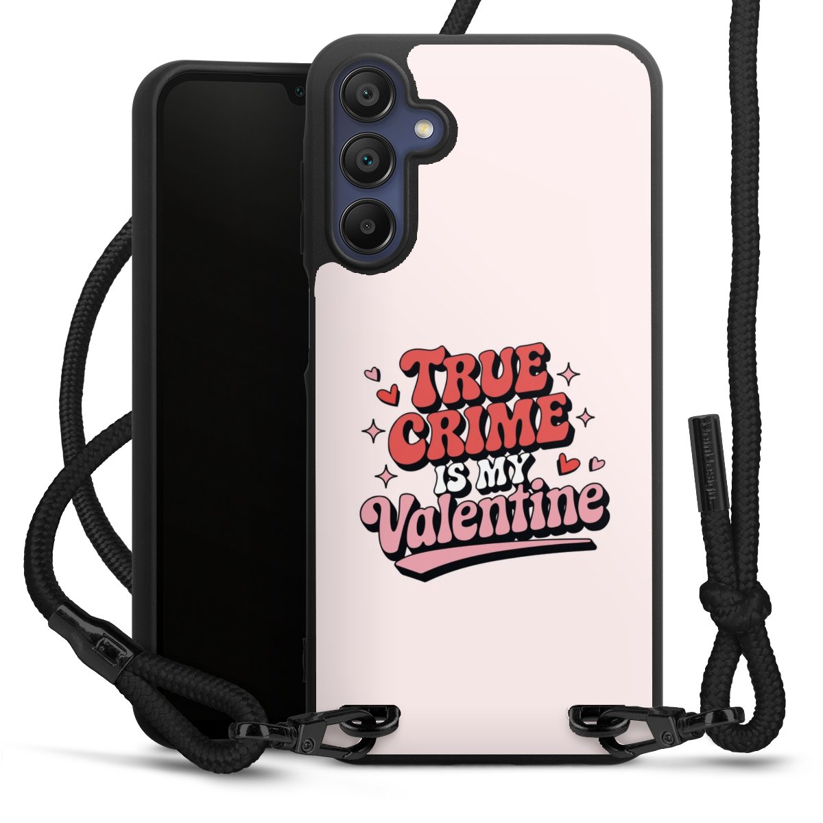 The matt black silicone case is made of flexible TPU (thermoplastic polyurethane) and offers robust protection. The durable, unbreakable material makes the cover flexible and dimensionally stable at the same time. The matte surface makes your design stand out more and is less susceptible to fingerprints and dirt. The stylish trend accessory fits comfortably in the hand and is perfectly complemented by the fabric (polyester) mobile phone strap. The braided fabric strap is approx. 1.70 metres long with a diameter of approx. 0.5 cm. Due to the special knotting technique, the length of the strap can be adjusted by simply pulling it, so that you can adapt it individually to your wishes. The practical case to wear around your neck is available with the fabric strap in black. As a little icing on the cake, we have provided the strap with a chic metal fastener in matt black. The strap is securely fastened to the case with loops made of high-quality genuine leather and press studs. The ends of the fabric strap are covered with metallic end caps and thus protected from fraying.