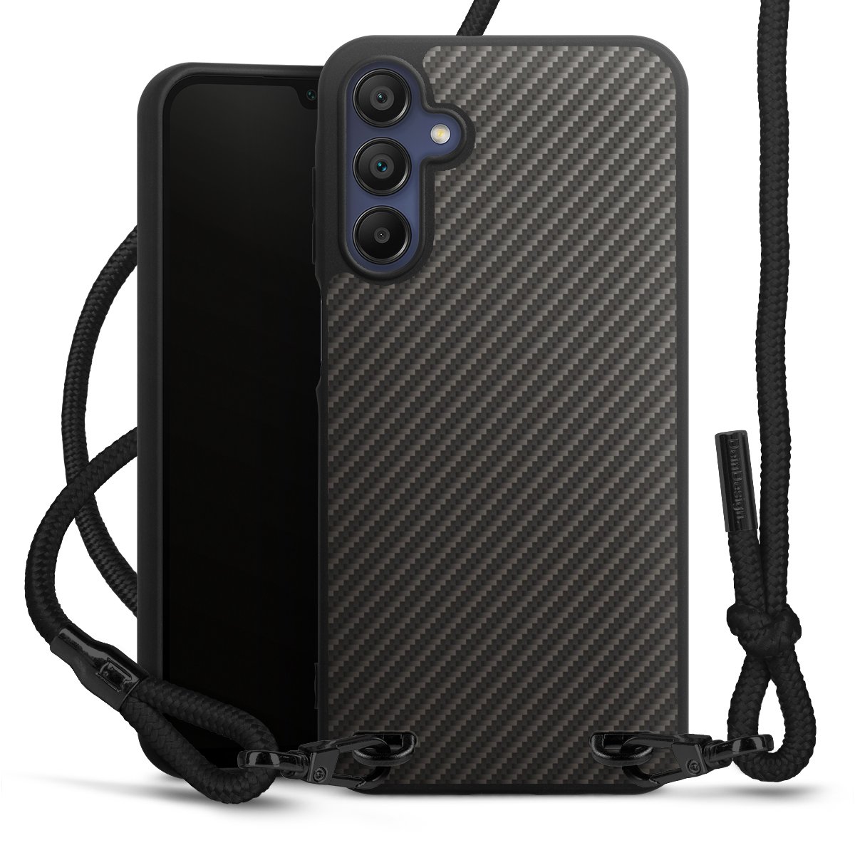 The matt black silicone case is made of flexible TPU (thermoplastic polyurethane) and offers robust protection. The durable, unbreakable material makes the cover flexible and dimensionally stable at the same time. The matte surface makes your design stand out more and is less susceptible to fingerprints and dirt. The stylish trend accessory fits comfortably in the hand and is perfectly complemented by the fabric (polyester) mobile phone strap. The braided fabric strap is approx. 1.70 metres long with a diameter of approx. 0.5 cm. Due to the special knotting technique, the length of the strap can be adjusted by simply pulling it, so that you can adapt it individually to your wishes. The practical case to wear around your neck is available with the fabric strap in black. As a little icing on the cake, we have provided the strap with a chic metal fastener in matt black. The strap is securely fastened to the case with loops made of high-quality genuine leather and press studs. The ends of the fabric strap are covered with metallic end caps and thus protected from fraying.
