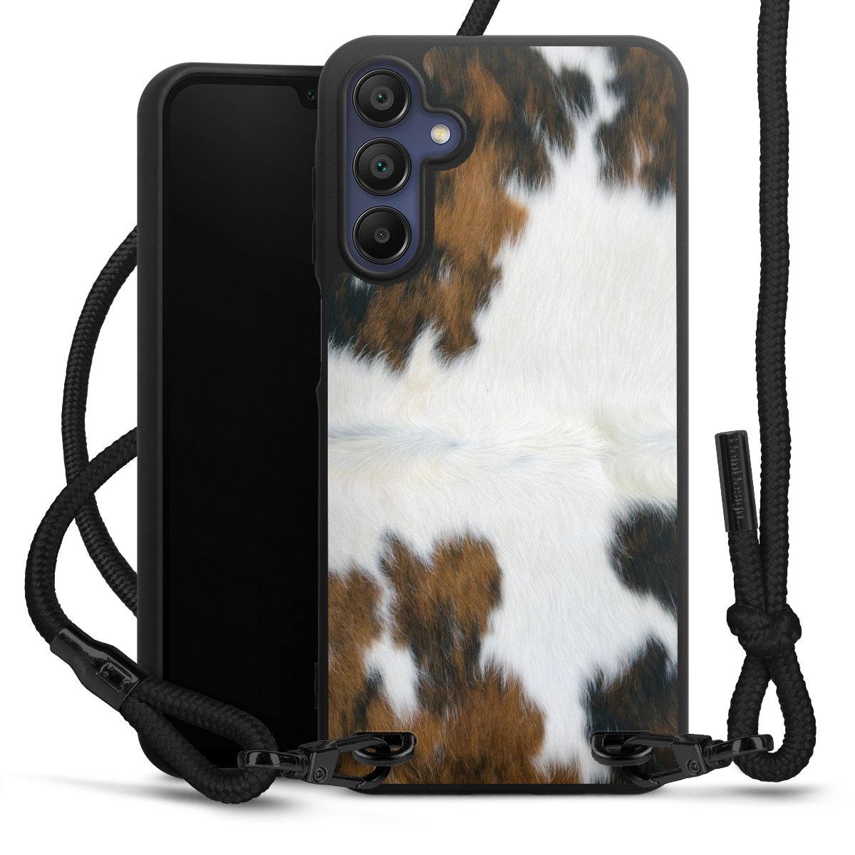 The matt black silicone case is made of flexible TPU (thermoplastic polyurethane) and offers robust protection. The durable, unbreakable material makes the cover flexible and dimensionally stable at the same time. The matte surface makes your design stand out more and is less susceptible to fingerprints and dirt. The stylish trend accessory fits comfortably in the hand and is perfectly complemented by the fabric (polyester) mobile phone strap. The braided fabric strap is approx. 1.70 metres long with a diameter of approx. 0.5 cm. Due to the special knotting technique, the length of the strap can be adjusted by simply pulling it, so that you can adapt it individually to your wishes. The practical case to wear around your neck is available with the fabric strap in black. As a little icing on the cake, we have provided the strap with a chic metal fastener in matt black. The strap is securely fastened to the case with loops made of high-quality genuine leather and press studs. The ends of the fabric strap are covered with metallic end caps and thus protected from fraying.