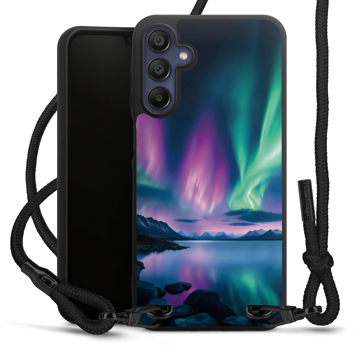 The matt black silicone case is made of flexible TPU (thermoplastic polyurethane) and offers robust protection. The durable, unbreakable material makes the cover flexible and dimensionally stable at the same time. The matte surface makes your design stand out more and is less susceptible to fingerprints and dirt. The stylish trend accessory fits comfortably in the hand and is perfectly complemented by the fabric (polyester) mobile phone strap. The braided fabric strap is approx. 1.70 metres long with a diameter of approx. 0.5 cm. Due to the special knotting technique, the length of the strap can be adjusted by simply pulling it, so that you can adapt it individually to your wishes. The practical case to wear around your neck is available with the fabric strap in black. As a little icing on the cake, we have provided the strap with a chic metal fastener in matt black. The strap is securely fastened to the case with loops made of high-quality genuine leather and press studs. The ends of the fabric strap are covered with metallic end caps and thus protected from fraying.