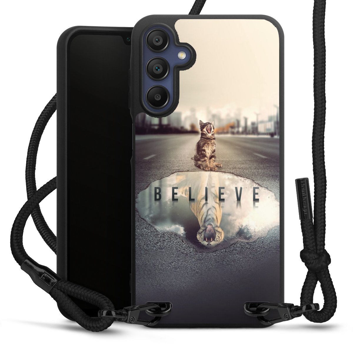 We use the solid direct print process for this phone case, which is why the print area only covers the back and the edge remains unprinted. The case to wear around your neck can be ordered unprinted, fully printed, or partially printed. For your design, either choose one of our exclusive shop motifs or get creative and create your own design, for example with photos and overlays. Design your own personal trend accessory and make an individual statement on the streets!