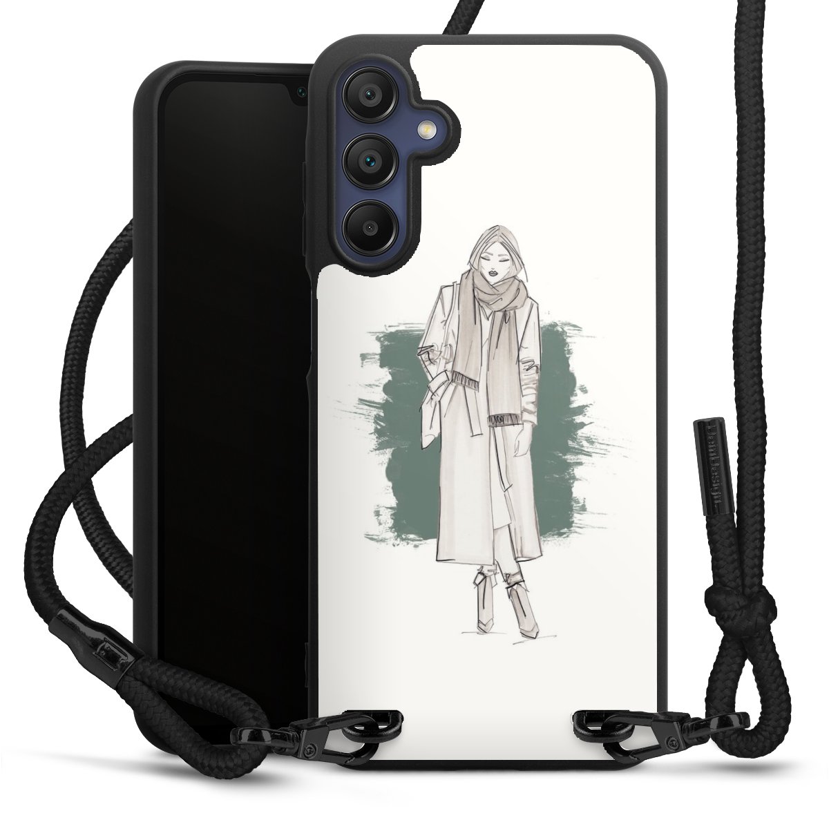 The matt black silicone case is made of flexible TPU (thermoplastic polyurethane) and offers robust protection. The durable, unbreakable material makes the cover flexible and dimensionally stable at the same time. The matte surface makes your design stand out more and is less susceptible to fingerprints and dirt. The stylish trend accessory fits comfortably in the hand and is perfectly complemented by the fabric (polyester) mobile phone strap. The braided fabric strap is approx. 1.70 metres long with a diameter of approx. 0.5 cm. Due to the special knotting technique, the length of the strap can be adjusted by simply pulling it, so that you can adapt it individually to your wishes. The practical case to wear around your neck is available with the fabric strap in black. As a little icing on the cake, we have provided the strap with a chic metal fastener in matt black. The strap is securely fastened to the case with loops made of high-quality genuine leather and press studs. The ends of the fabric strap are covered with metallic end caps and thus protected from fraying.